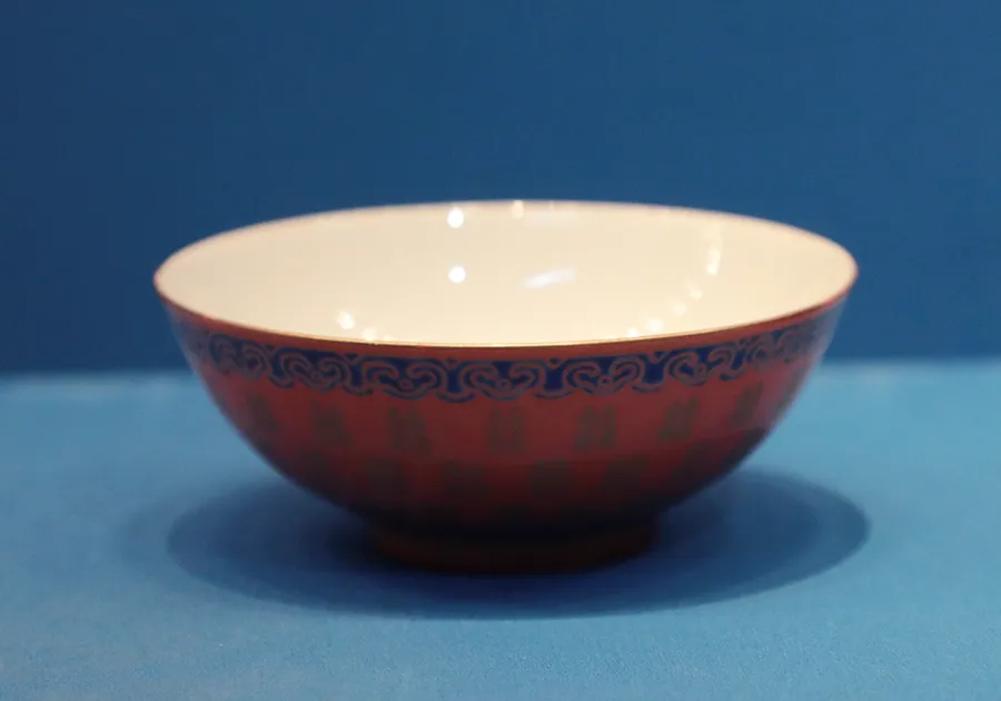 还有个明代收藏家叫项元汴,在所著的《历代名瓷图谱》里写得更直白:积红其色艳若朱霞,真乃历代名瓷之首冠也,今虽悬千金购求亦不可得矣。可见在明代当时,宣德宝石红釉就已经被视为名瓷之冠,千金难求了。上图:矾红地描金 “囍” 字纹瓷碗 清宣德后再到明末,时事变换,估计那位历史中没记载的天才窑工团队后续无人,红釉工艺迅速衰落,到正德、嘉靖后高温红釉工艺几乎失传,从嘉靖年间起,无奈以低温矾红(铁红)釉替代高温铜红釉,用于祭祀和日用。