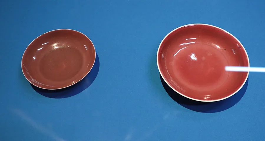上图:宣德红釉盘(右)和普通红釉盘(左)的发色对比下面就要看清朝人的努力了。