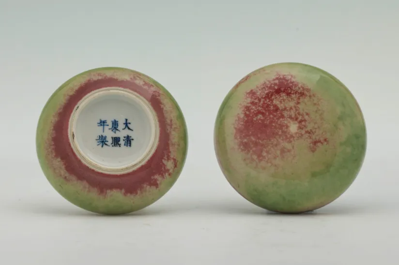 郎窑红瓷器底足多为米汤底(米黄) 或苹果绿底,少见红釉底,基本不署本朝年款,偶有仿宣德 “大明宣德年制” 款。
