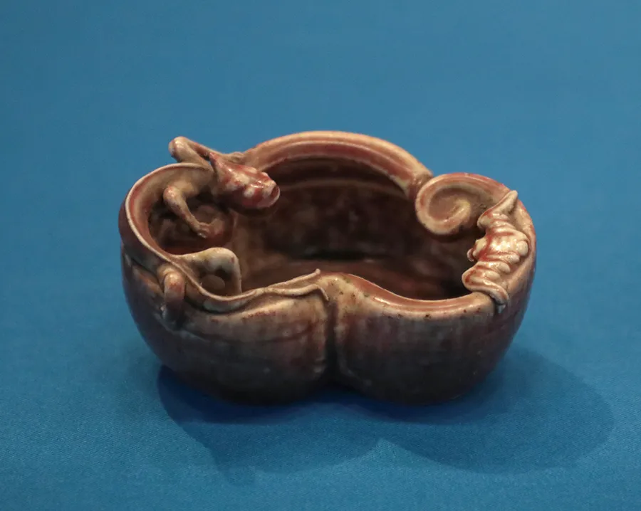 如果色块比主体釉色略红一点,似片片桃花,就称为“桃花片”。如果是青绿色的色块,星星点点状的,就称为“苔点绿”,连成片的叫“苹果绿”,比“苹果绿”略浅点的成片色块就称为“苹果青”。最妙的是,有的时候青、绿、浅绛、深红各种漂亮的釉色搭配得当,会形成一幅迷人的春日胜景图,恰如诗中所描述的“绿如青水初生日,红似朝霞欲上时”上列图:豇豆红镗锣洗 图片来自冯玮瑜收藏上图:豇豆红印泥盒 来自上博官网第二档次的一般称为“榆树皮”,现代人大多数不知道榆树皮是什么样,古人常常作为救荒之用,在淘宝上搜了一下,想不到真的是什么都有,还有很多卖榆树皮的,就是下图这样的颜色不均余的浅淡红褐色。上图:豇豆红釉太白尊 清康熙 南京市博物馆南京市博物馆这次展出的这一只豇豆红釉太白尊,大概算得上是“榆树皮”,颜色显得浅淡了些,但也有可观赏的地方,也算是一个品种吧。“驴肝”指发色暗红并带有不少斑驳的黑点,“马肺”更差,基本上已经近灰黑色。尽管如此,因为豇豆红釉实在是珍贵,古人也并没有把“驴肝马肺”像其它釉色的残次品一样销毁,而是作为一个品种保留了下来。上图:豇豆红釉螭虎纹水盂 清 南京市博物馆 藏这次展览中也展出了一只标为“豇豆红釉”的小水盂,估计不是康熙本朝的作品,而是晚清时的仿作,其发色可称为“驴肝”色吧。上图:上博的另一只豇豆红釉太白尊,这个颜色也算接近“驴肝马肺” 图片来自上博官网上图:豇豆红为吹釉,所以无大器,最常见的器形一般称为“八大码”这八大码分四高四矮,四高是:柳叶瓶、莱菔瓶、蟠魑瓶、菊瓣瓶。