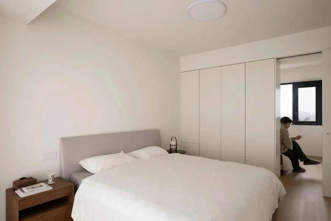 父母的卧室我们以未来可能性的目光丈量当下。卧室划分为两个套房移门开合之间,是独立与守望的微妙平衡。