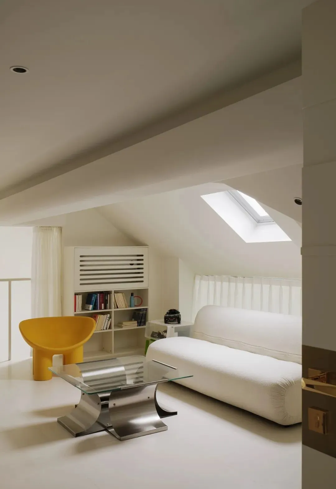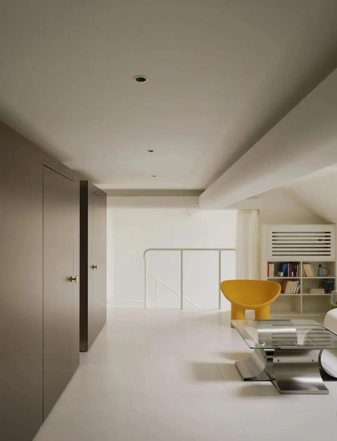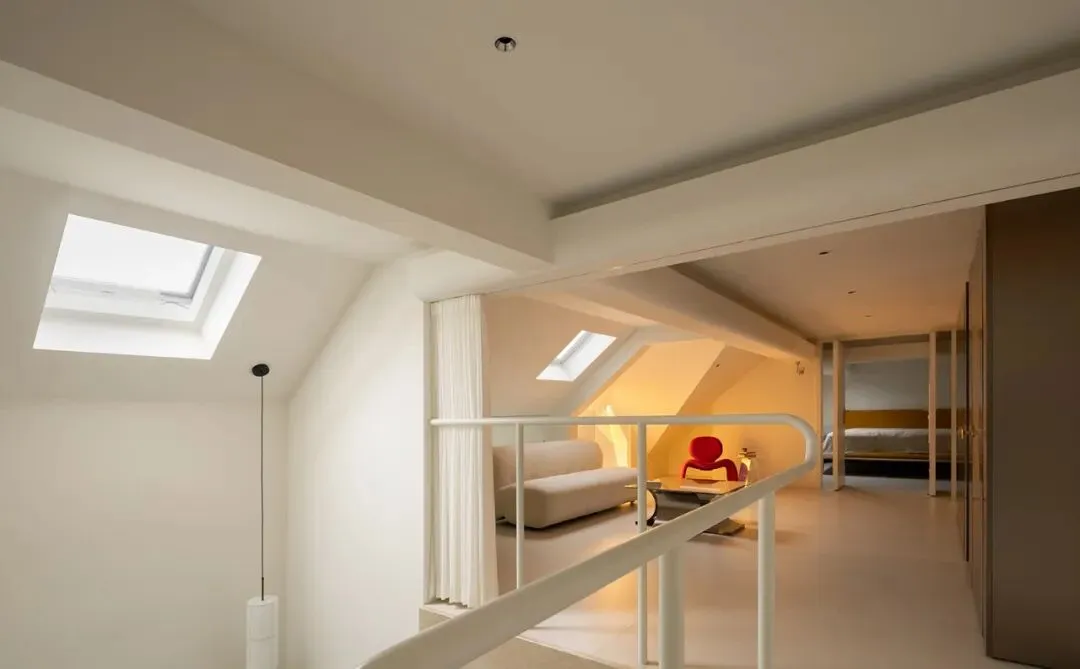 光从天窗倾泻而下,那些无法直立的负空间,在设计的解构下蜕变为隐形的记忆体,以柜体的形式收纳着时光的碎片。