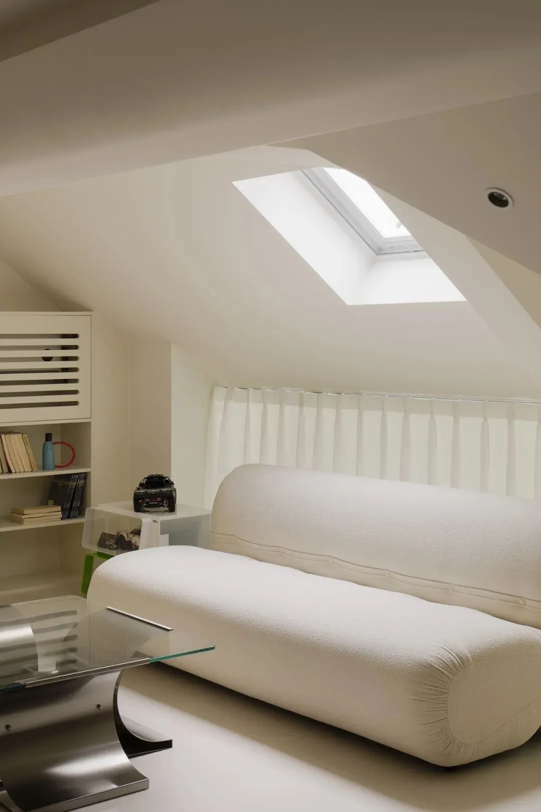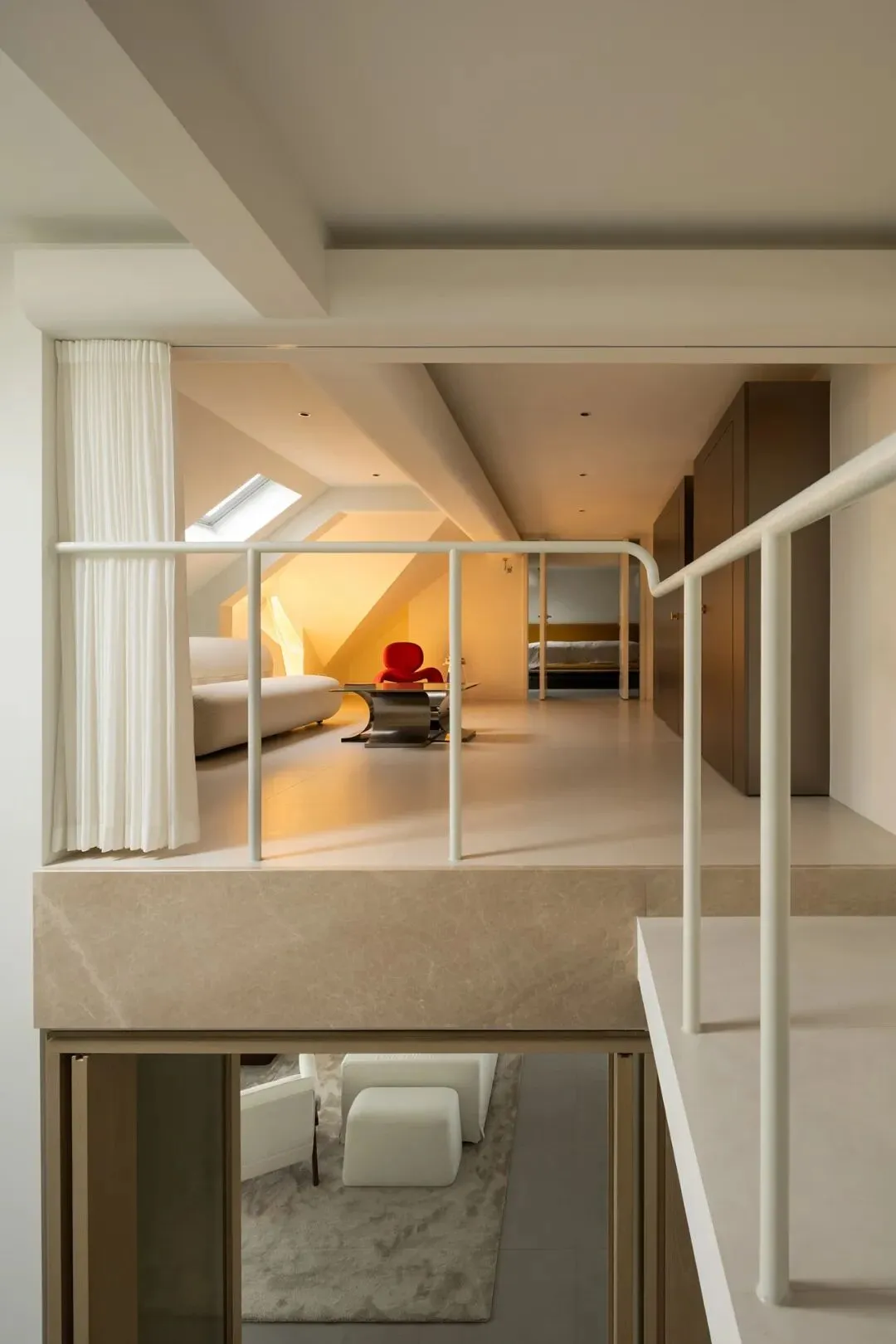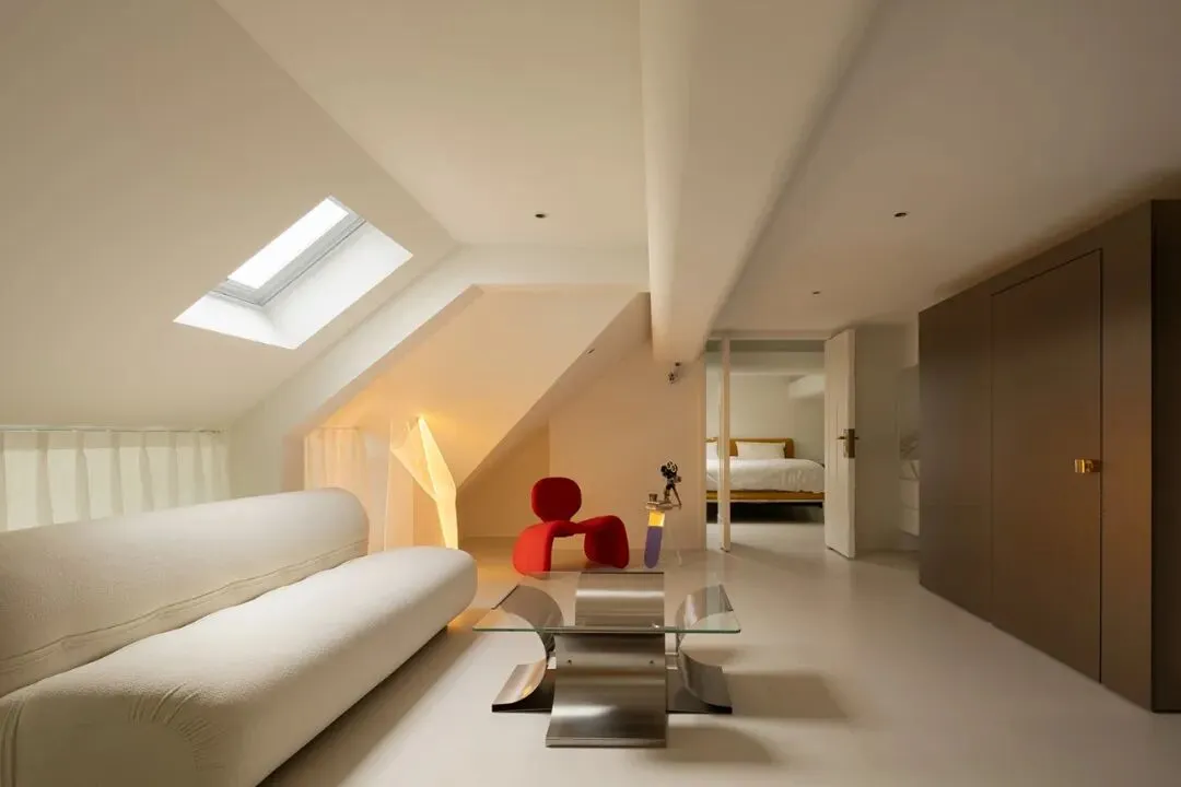 光从天窗倾泻而下,那些无法直立的负空间,在设计的解构下蜕变为隐形的记忆体,以柜体的形式收纳着时光的碎片。