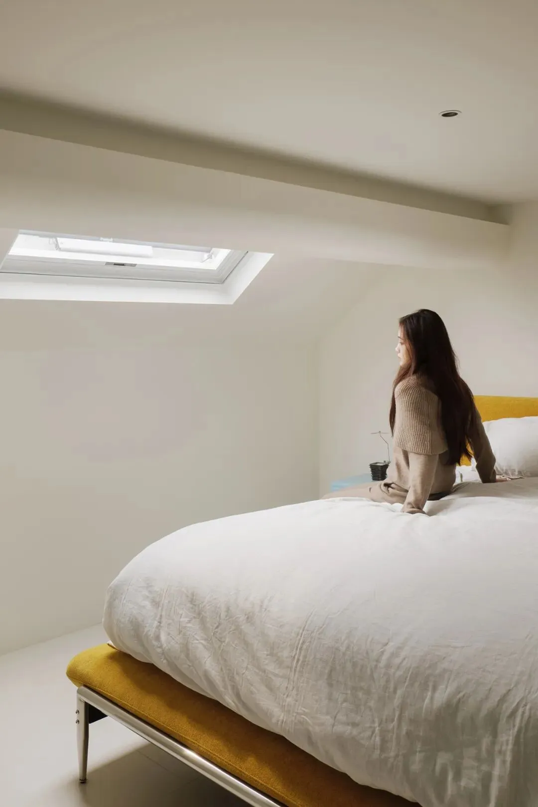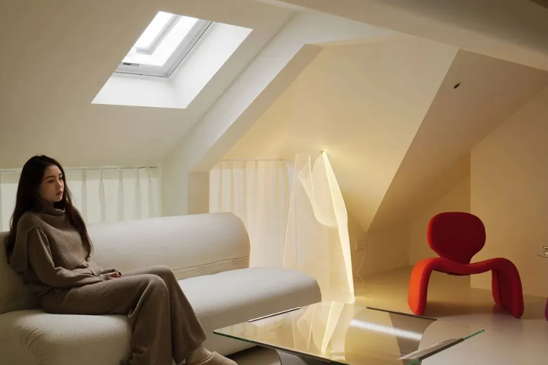 公共区保留着开放的格局,不同质感的家具能根据需求自由重组,当她躺在沙发上,透过天窗凝视真实的星空时,楼下父母生活产生的轻微震动会通过结构传来,就像飞船接收到的来自地球的引力波。