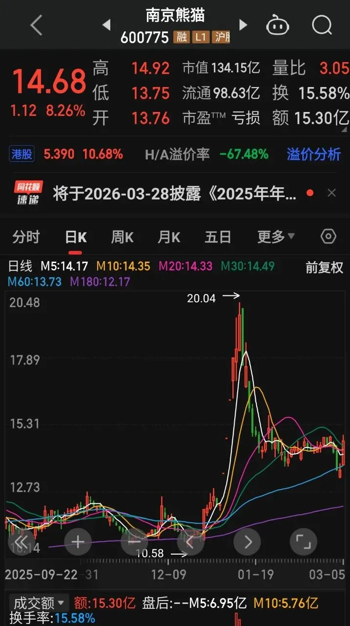 南京熊猫,3月5日收盘报14.68元,涨幅8。26%,全天成交额超15亿元,换手率接近15。8%。南京熊猫做智慧交通、军工电子、电子制造,背靠央企,城轨通信、军工通信这块有实实在在的订单。我身边有做短线的朋友,上周小仓位试了南京熊猫,这两天跟着板块走,走势还算稳。它的业务偏向硬核基建+科技转型,盘子不大,波动比较活跃,喜欢做波段的可以多留意南京熊猫的分时节奏。