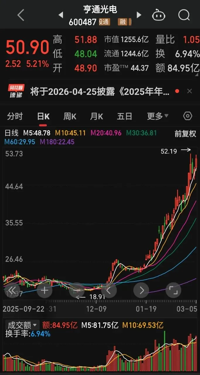 亨通光电。这只是光通信、海缆赛道的龙头,3月5日收盘价50.90元,单日涨幅5.21%,成交额84.95亿元,近三个月涨幅超150%。亨通光电的业务很扎实,光纤光缆、海缆、光模块都有布局,高端空芯光纤、海上风电海缆订单充足,机构关注度一直很高。我自己看盘的时候发现,亨通光电每次回踩都有承接,大资金进出明显,适合中线拿一拿,也适合短线做高低切换。不管是算力基建还是海洋能源,亨通光电都踩在风口上,基本面够硬。