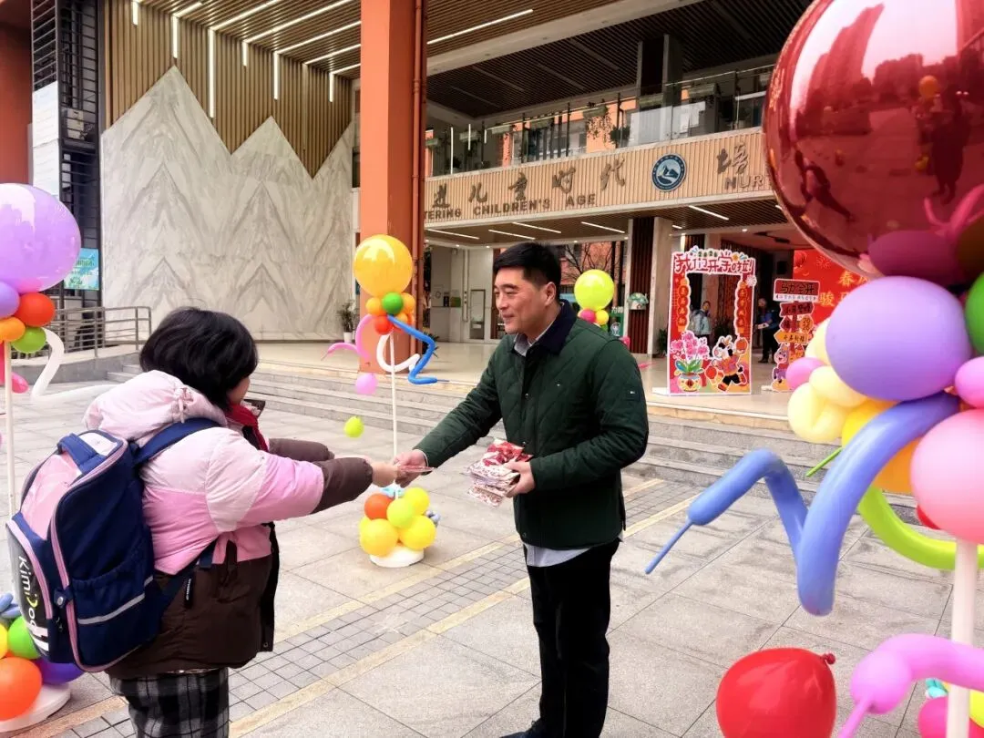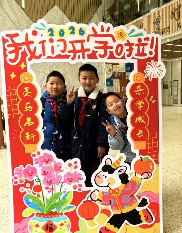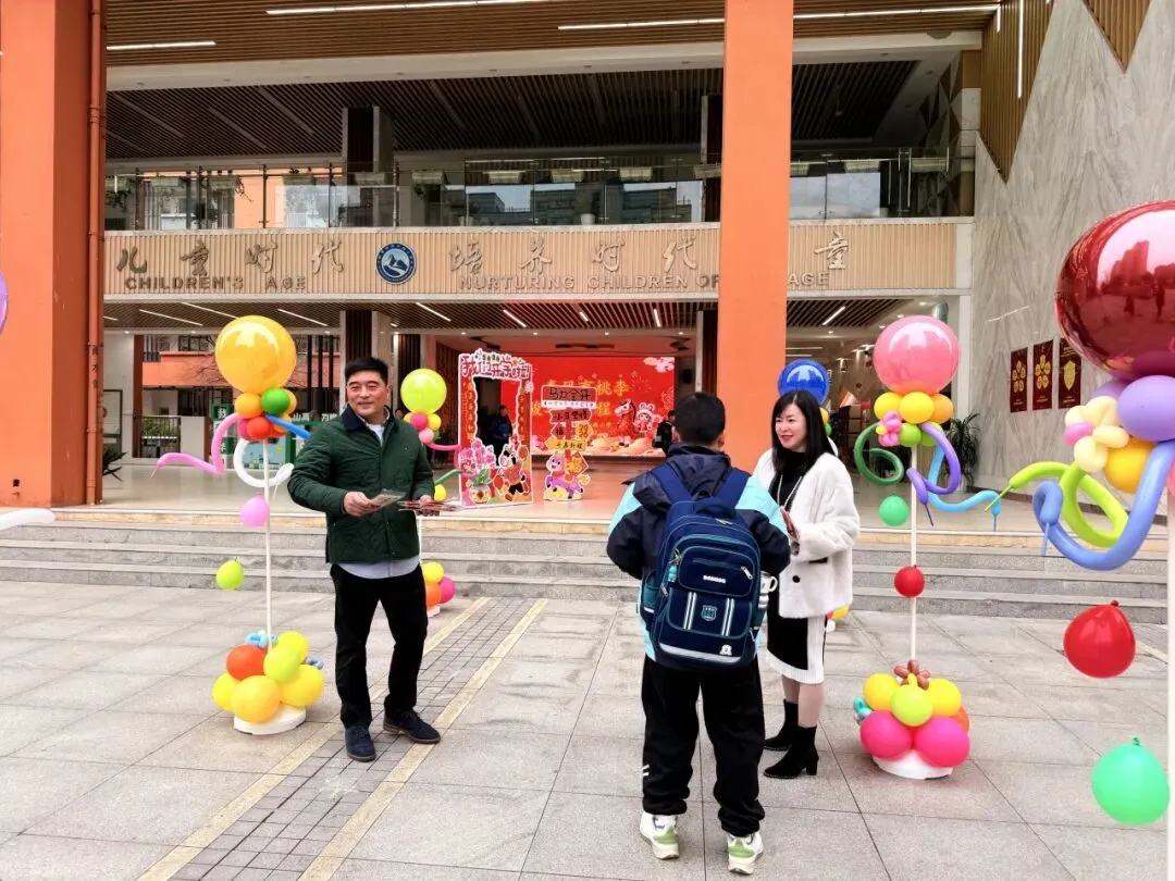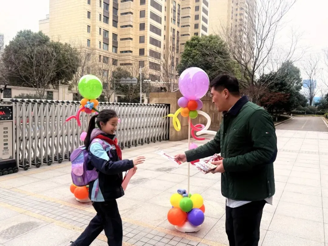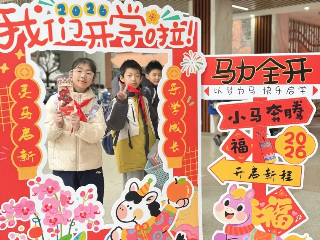 典礼前夕,校园内早已洋溢着浓厚的开学氛围,校门口精心打造的开学典礼主题场景氛围感拉满。清晨入校时分,汪洋校长、张泰兴副校长、李静副校长在校门口为同学们亲手分发了精心准备的马年文创纪念品,一份份满载心意的开学礼,让孩子们在踏入校园的第一刻,就感受到了新学期的惊喜与温暖。