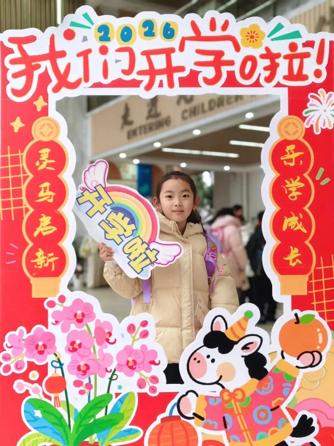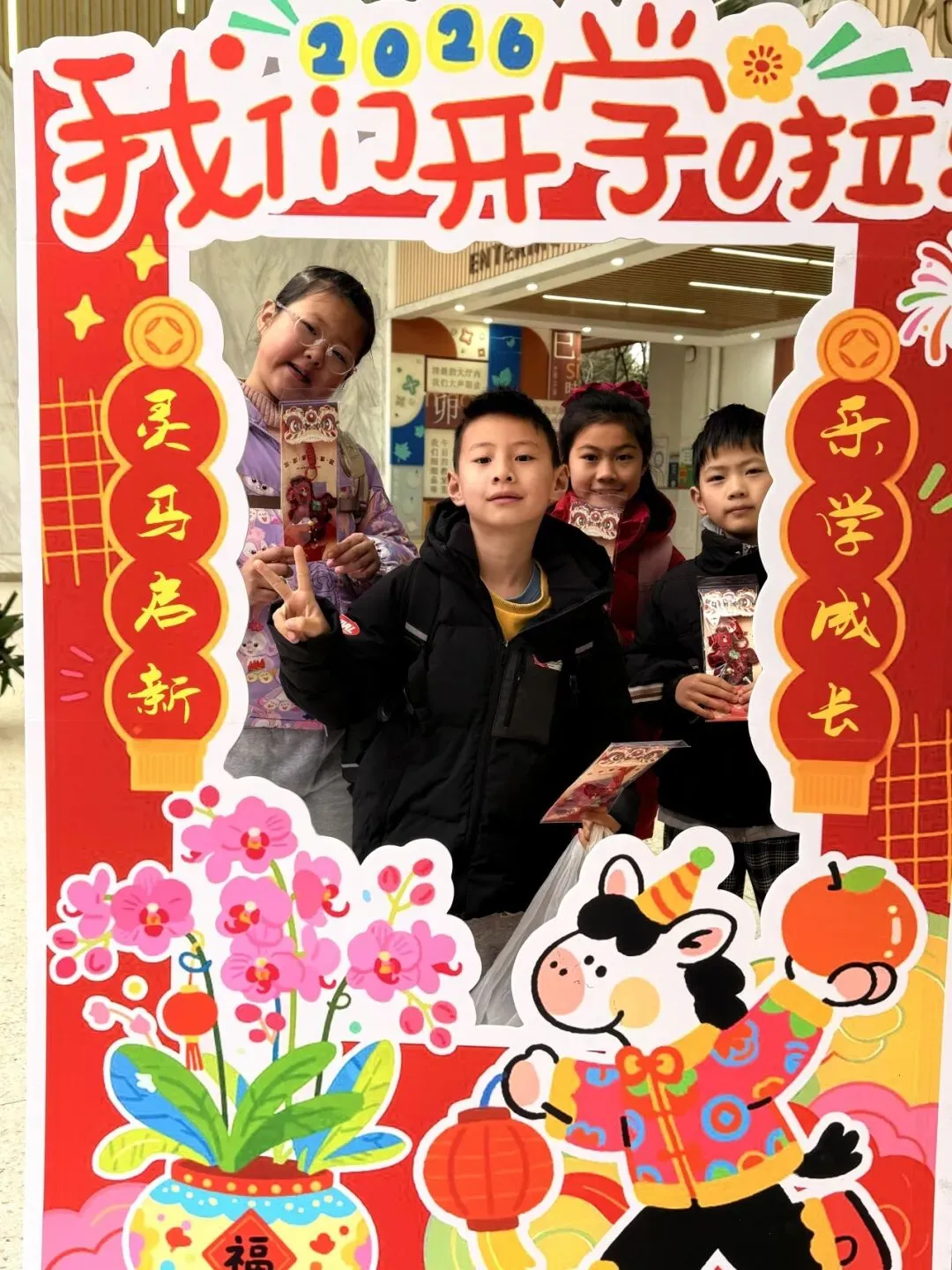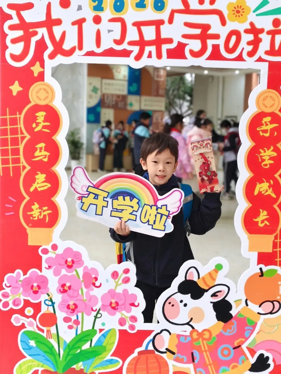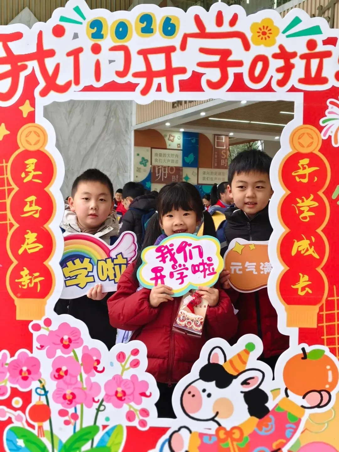 典礼前夕,校园内早已洋溢着浓厚的开学氛围,校门口精心打造的开学典礼主题场景氛围感拉满。清晨入校时分,汪洋校长、张泰兴副校长、李静副校长在校门口为同学们亲手分发了精心准备的马年文创纪念品,一份份满载心意的开学礼,让孩子们在踏入校园的第一刻,就感受到了新学期的惊喜与温暖。
