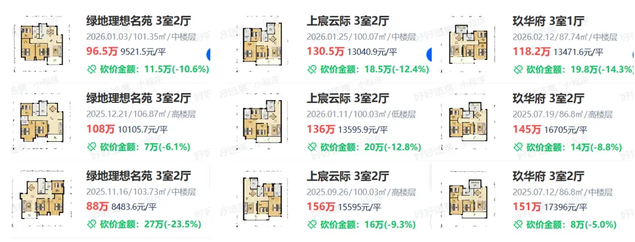 东片区,绿地理想城、上宸云际、玖华府,当年新房卖到2.3万~2.4万/㎡,如今二手成交价普遍在1.5万左右,有的甚至更低——比当年玖华府楼面价还便宜1万多——