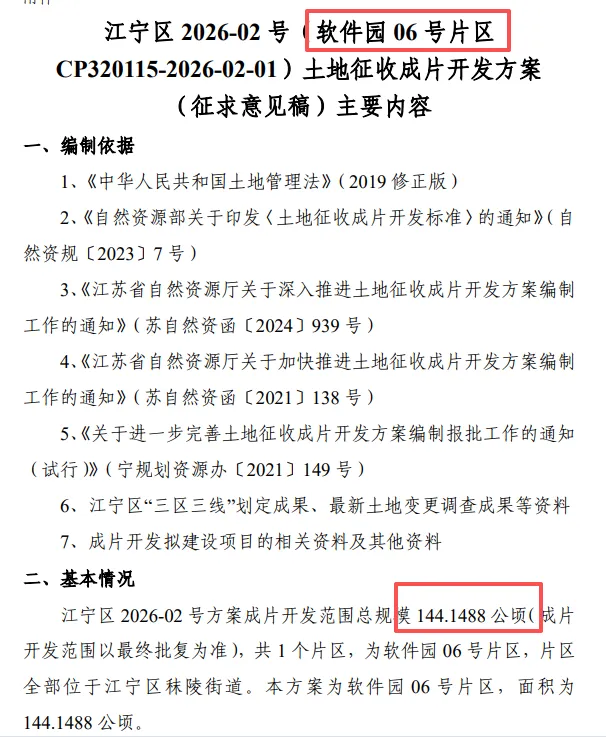 就在近日,南京市江宁区正式发布《软件园06号片区土地征收成片开发方案》,144公顷(约2162亩)土地启动连片开发!