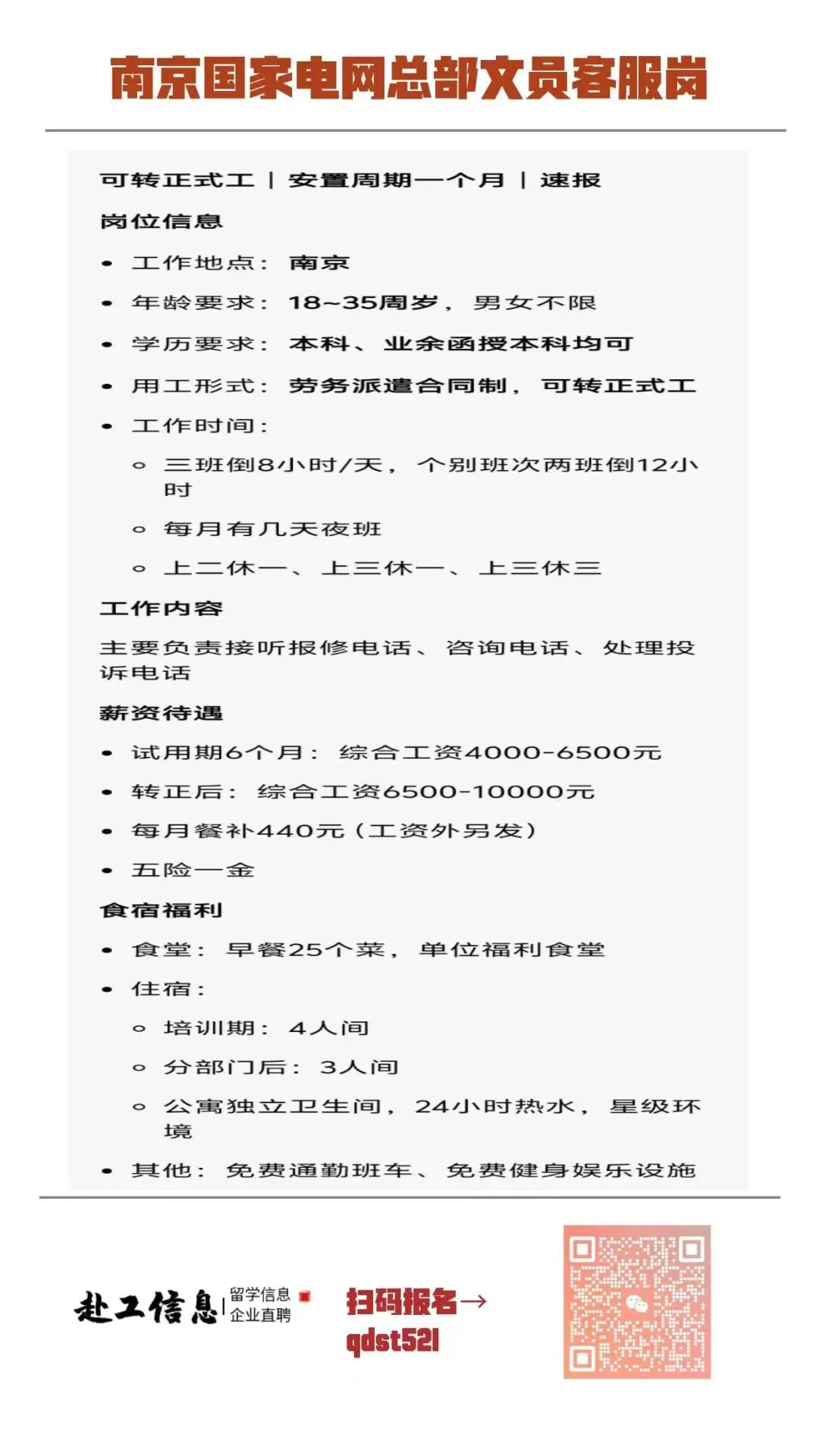 【南京国企汽车厂】,长白班,缴纳五险一金,免费体检,免费吃饭,底薪4300,综合7000-9000!