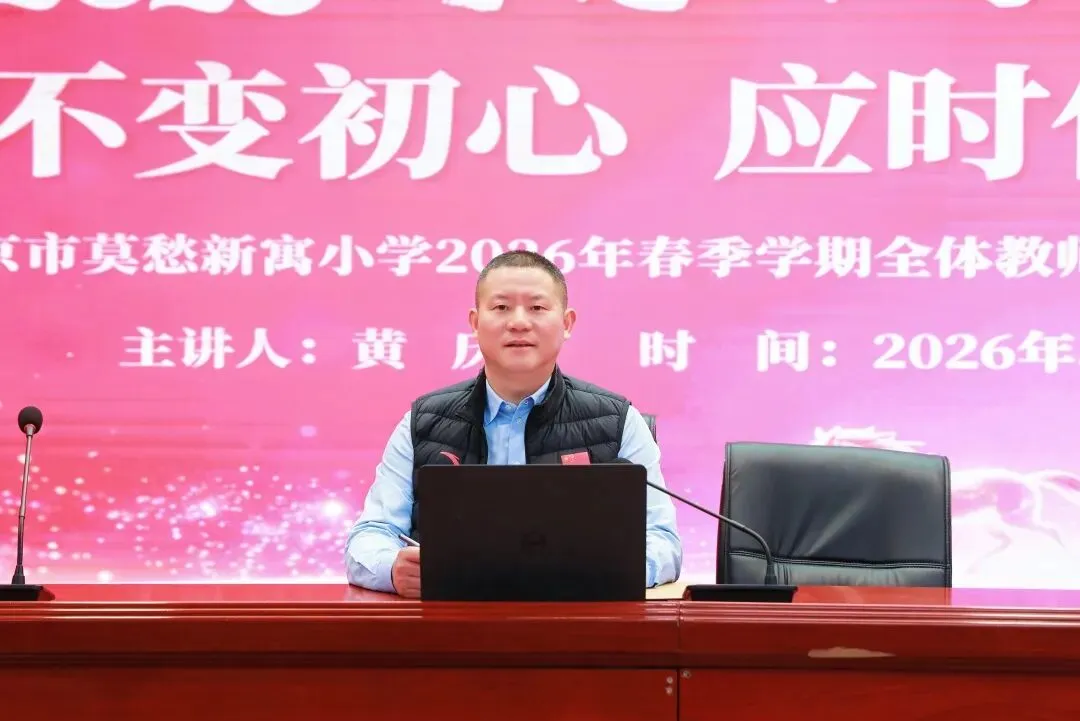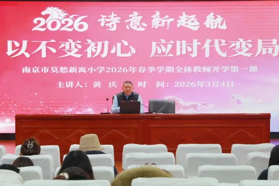 2026年3月4日,南京市莫愁新寓小学全体教师在春意盎然的校园内齐聚一堂,召开2025-2026学年第二学期全体教师会。