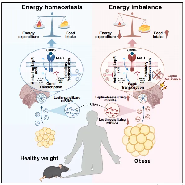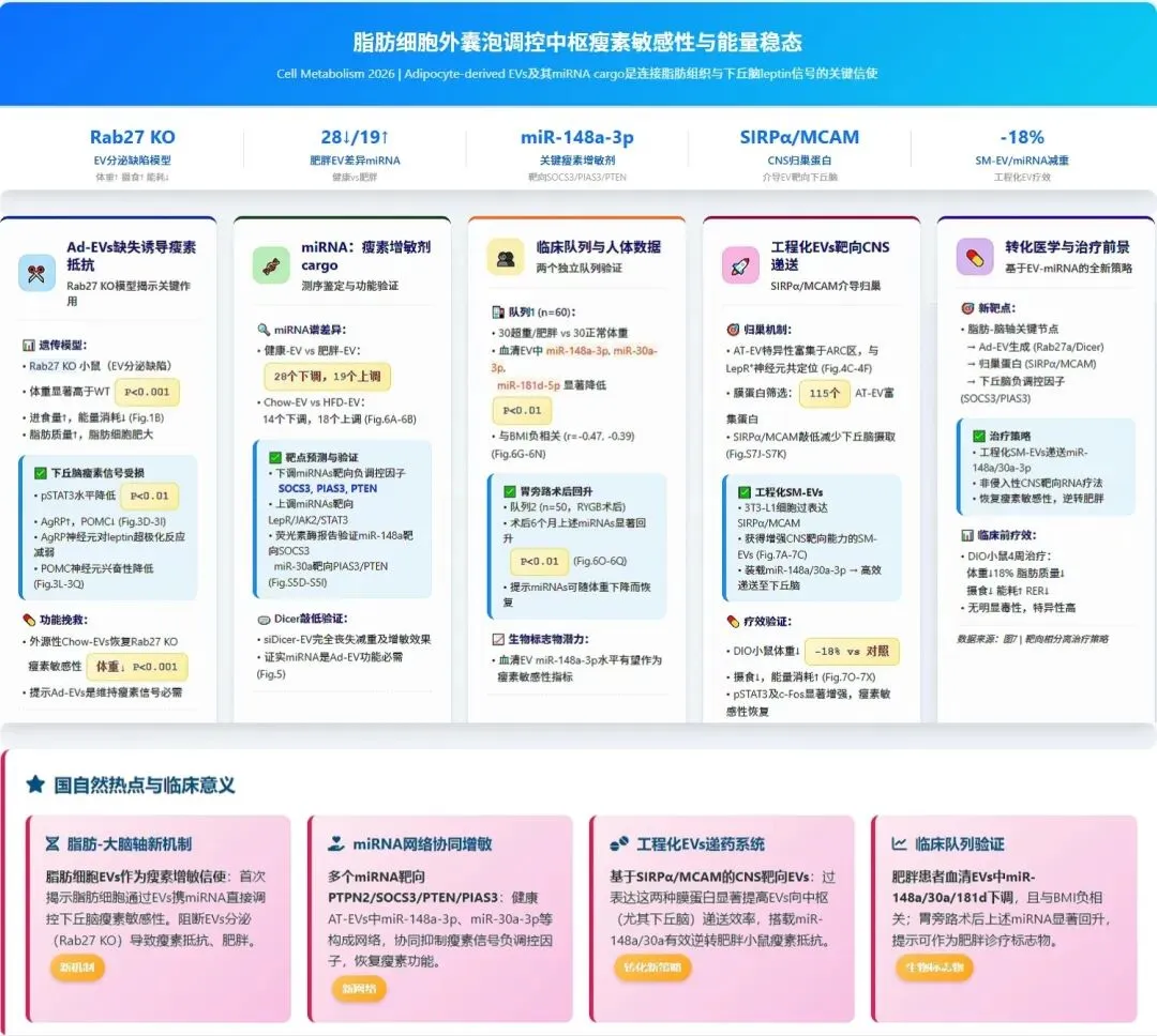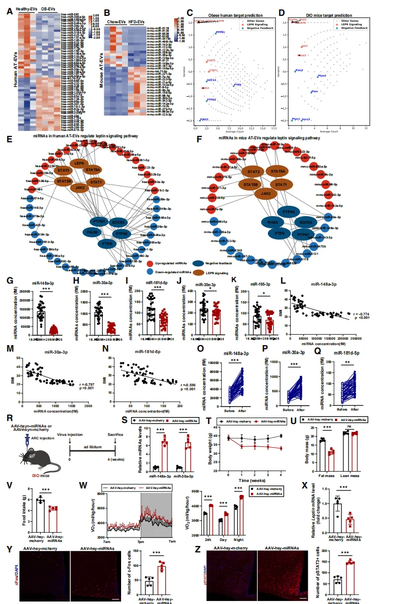 深度测序分析显示,肥胖个体EV中一群具有瘦素增敏潜能的miRNA(如miR-148a-3p、miR-30a-3p)显著下调,而可能破坏瘦素信号的miRNA则上调【图6A-F】。
