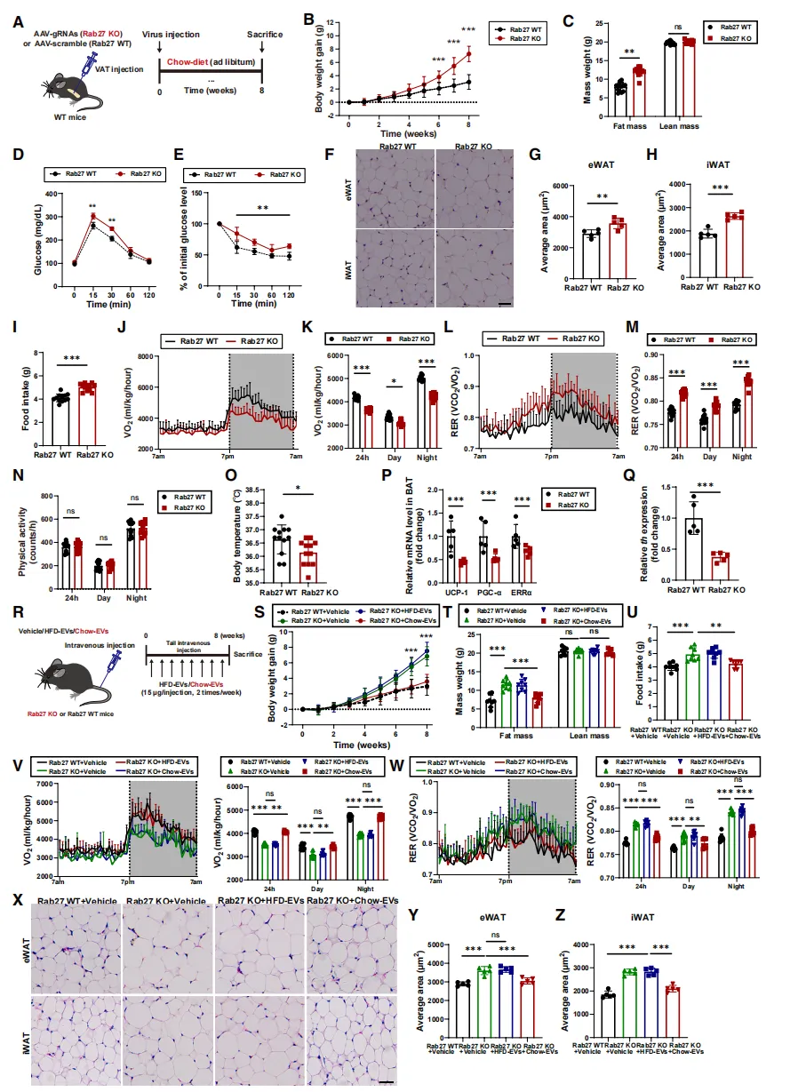 为探究脂肪组织来源细胞外囊泡(Ad-EVs)在能量代谢中的作用,研究人员构建了脂肪组织EV分泌缺陷小鼠(Rab27 KO)。