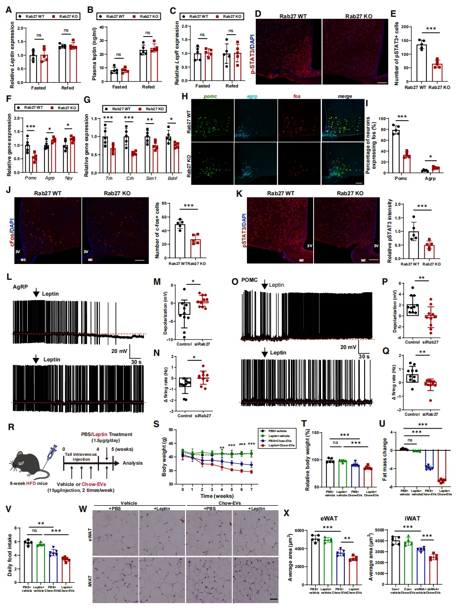 电生理记录直接证实:失去EV信号后,AgRP和POMC神经元对瘦素的反应均明显变差【图3L-Q】。