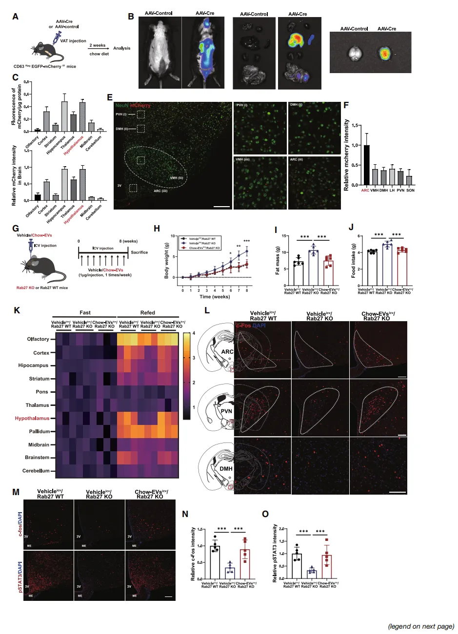 更直接的证据:将正常EV直接注入基因缺陷小鼠的脑室,竟能“修复”全身EV缺失导致的代谢紊乱【图4H-L】。这证实脂肪EV直接作用于中枢神经系统。