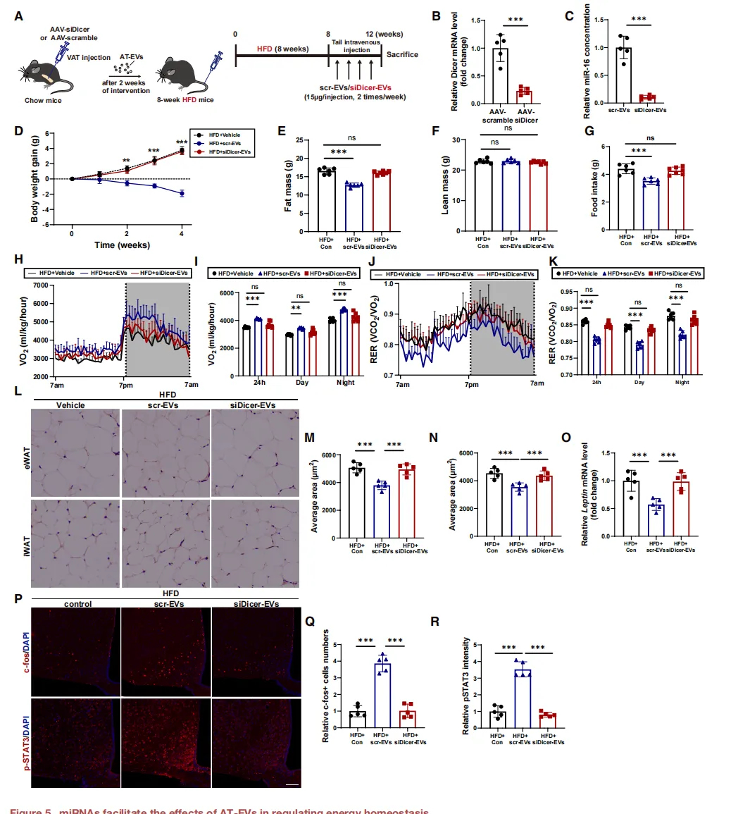 当通过敲低Dicer阻断脂肪细胞miRNA生成后,其来源EV完全丧失减肥功效【图5D-O】。