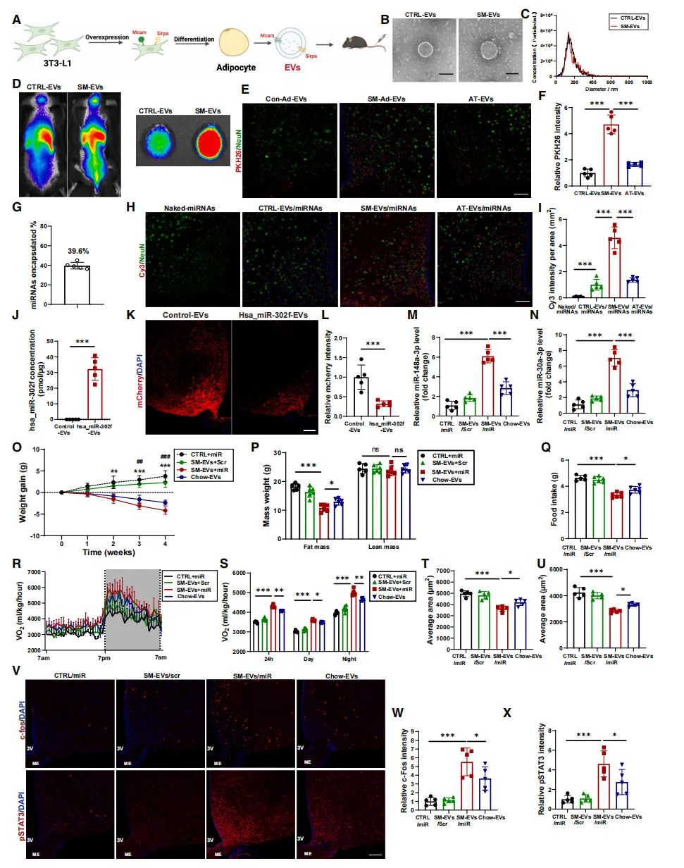该工程化EV能高效递送miRNA至下丘脑【图7D-I】,并在肥胖小鼠模型中恢复瘦素敏感性,显著降低体重、减少摄食、增加能耗【图7O-X】。