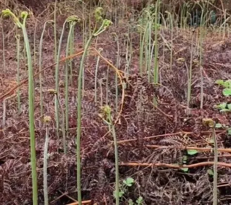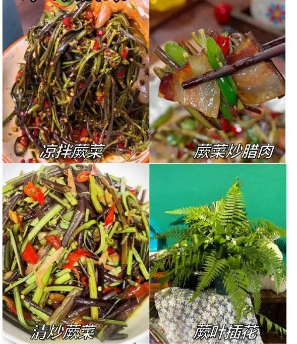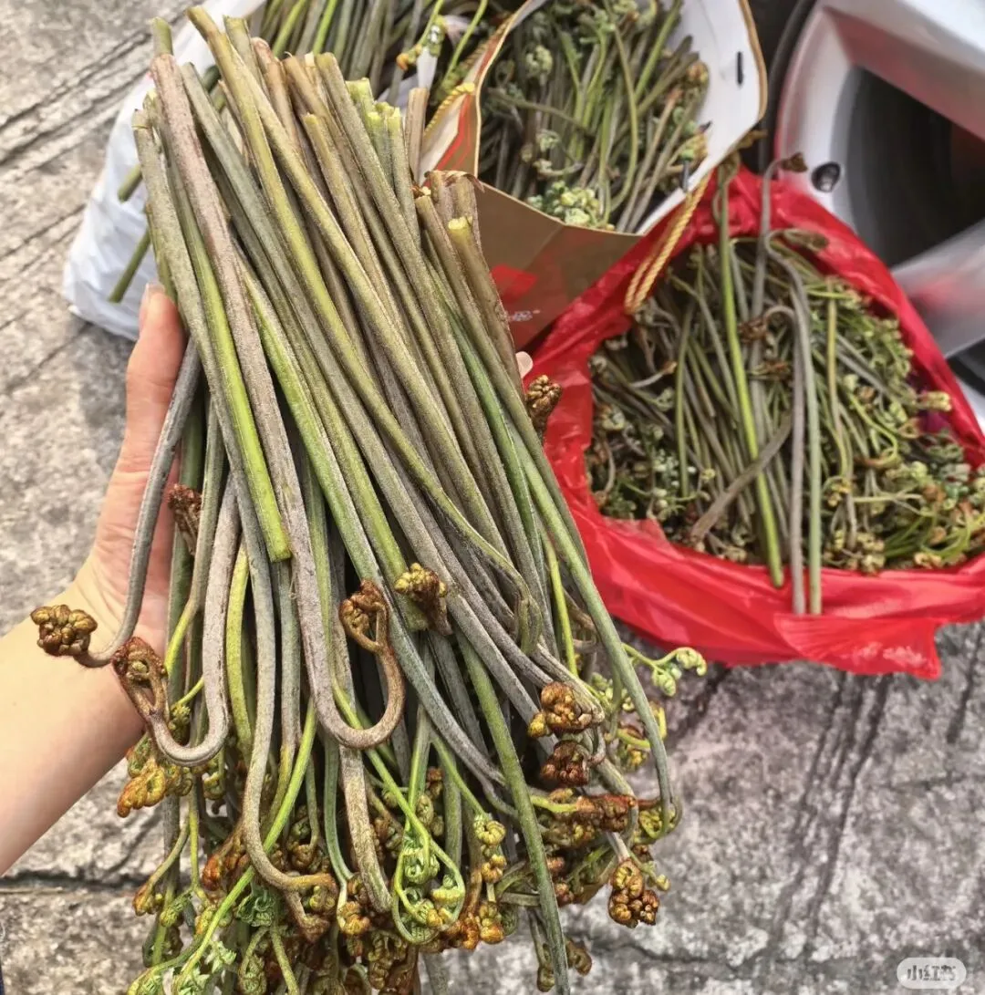🥬蕨菜堪称“山菜之王”,生长在阳光充足的山坡或林缘。辨识度较高,嫩芽卷曲带红褐色的绒毛。口感脆嫩爽口,带着一丝微苦后又回甘。要注意食用前需用沸水焯烫,以去除部分涩味和潜在的原蕨苷。