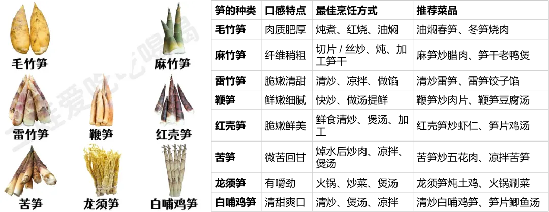 🥬春笋一般在2-4月采摘,山区竹林最鲜嫩。可油焖、清炒、烧肉、煲汤,适合各种做法;口感脆嫩鲜甜、清香爽口,鲜掉眉毛。