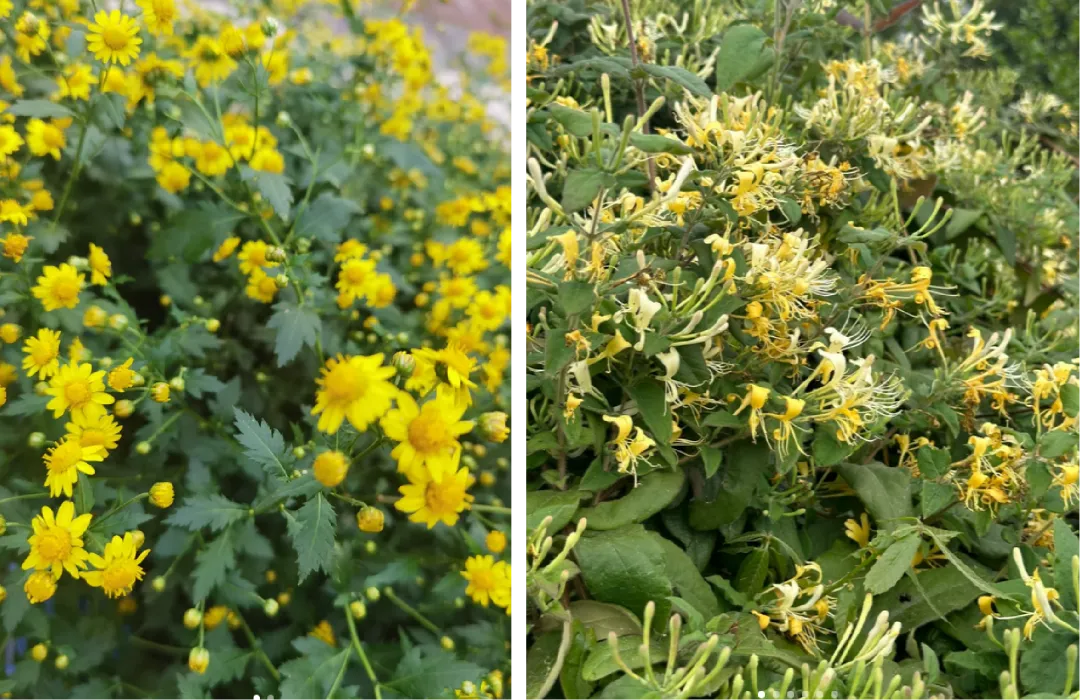 🥬野菊花、金银花:野菊花山野里居多,9-11月采收,花苞半开、未完全绽放时采最佳;金银花主要分布于城市山野交界处,4-7月采收,以花苞未开放、呈青白色时采摘最香。二者都可以采摘晒干制成花茶,降火清热。