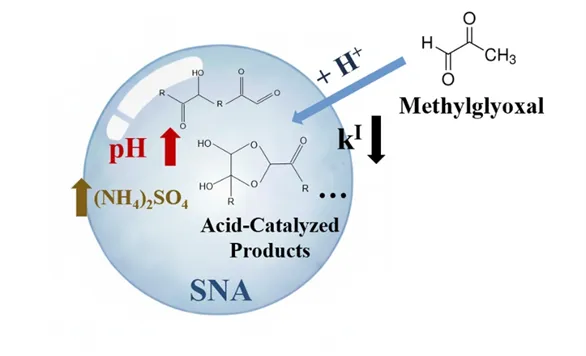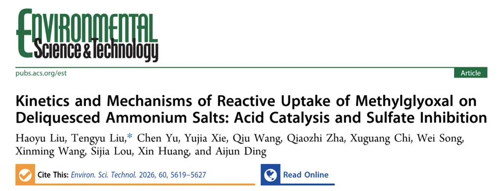 Reproduced from [Liu, H., et al. Environ. Sci. Technol. 2026, 60, 7, 5619-5627] with permission from the American Chemical SocietyLiu, H., Liu, T., Yu, C., Xie, Y., Wang, Q., Zha, Q., Chi, X., Song, W., Wang, X., Lou, S., Huang, X., Ding, A. Kinetics and Mechanisms of Reactive Uptake of Methylglyoxal on Deliquesced Ammonium Salts: Acid Catalysis and Sulfate Inhibition. Environmental Science & Technology, 2026, 60, 7, 5619-5627https://pubs.acs.org/doi/10.1021/acs.est.5c13815