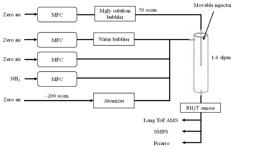 实验采用85 cm长的石英流动管,内壁涂有卤化蜡以减少壁损失。气溶胶通过雾化器产生,与NH3和甲基乙二醛混合后在流动管中反应,通过AMS和SMPS实时监测气溶胶组成和粒径分布。通过可移动进样器调节反应时间,总反应时间不超过70秒,确保实验条件(如气溶胶pH和组成)的稳定性。气溶胶pH通过E-AIM模型结合Picarro测量得到的NH3浓度计算,控制在3.1-4.4范围内,与实际大气气溶胶pH吻合。甲基乙二醛摄取系数的测定