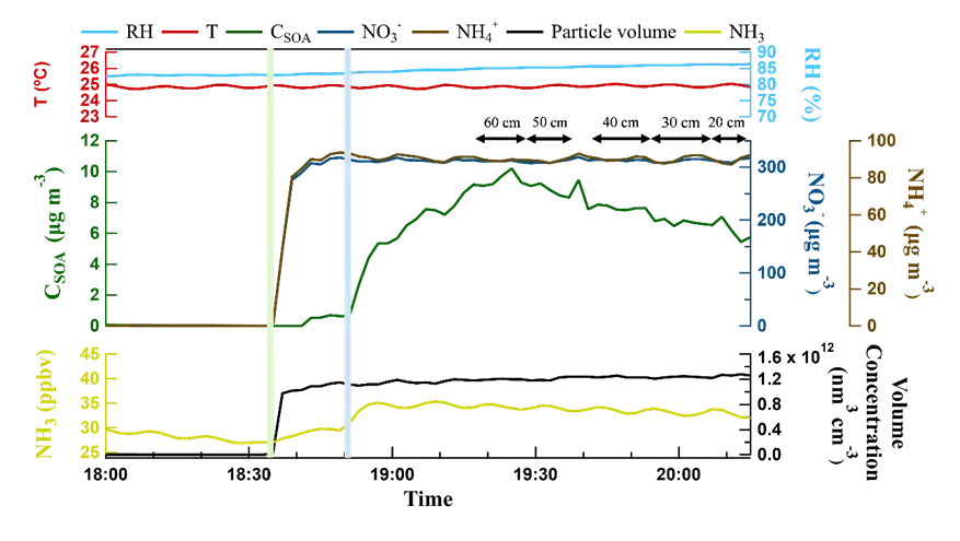 Fig. 2.Time series of T, RH, NH3, background corrected concentrations of carbon atom (CSOA), nitrate mass concentration, ammonium mass concentration, and particle volume concentration for a typical experiment. Green and blue shading areas indicate the injection of aerosol particles and methylglyoxal.