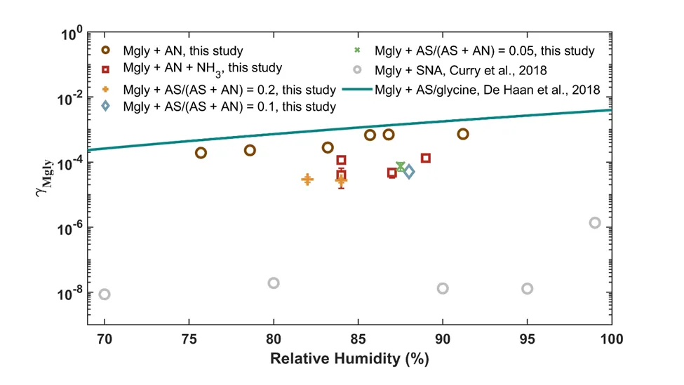 Fig. 3.Dependence of γMglyon RH and aerosol composition. The data for SNA aerosols was calculated using the functions from Curry et al. (2018) at pH = 3.26. All error bars represent one standard deviation. Some error bars are smaller than the symbol size.