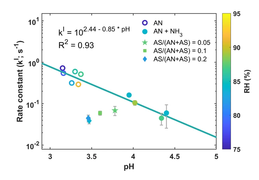 Fig. 4.First order aqueous loss rates (kI) for Mgly on various aerosol compositions at different aerosol pH. The green line represents a logarithmic fit for kI(AN and AN + NH3) versus aerosol pH values. Data are colored by RH. All error bars represent one standard deviation. Some error bars are smaller than the symbol size.通过添加NH3调节气溶胶pH,研究发现当pH从3.15升至4.4时,γMgly降低2-10倍。基于Hanson等人(1994)的框架,计算出一级反应速率常数(kI),并建立了kI与pH的强对数关系(R2 = 0.93):kI = 102.44-0.85pH。这一负相关性表明甲基乙二醛的摄取反应由酸催化反应主导,可能主要通过半缩醛/缩醛低聚物形成进行。硫酸盐抑制作用