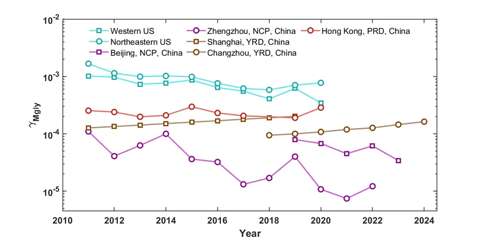 Fig. 5. Annual changes of γMglycalculated using the updated parameterization assuming T = 25 °C and AS/(AS+AN) = 0.2 with aerosol pH for different regions in China and US. Aerosol pH values were taken from the literatures for the following regions: western US, northeastern US, Beijing in North China Plain (NCP), Zhengzhou in NCP, Shanghai in Yangtze River Delta (YRD) in China, Changzhou in YRD, and Hong Kong in Pearl River Delta (PRD) in China.基于更新的参数化方案,计算了中国和美国不同地区γMgly的年际变化。结果显示,美国地区的γMgly显著高于中国,差异可达一个数量级,表明甲基乙二醛对美国SOA的贡献可能更为重要。从时间趋势看,2011-2020年间,美国西部和东北部的γMgly分别下降了66%和54%;中国华北平原的γMgly年均下降约0.9×10-5 yr-1,而长三角地区却以约6%的年增长率持续上升。长三角地区夏季植被茂盛、甲基乙二醛浓度较高,同时气溶胶pH处于全年最低水平,这些因素可能共同导致该地区甲基乙二醛对SOA的贡献日益显著,值得重点关注。未来严格的污染控制政策(如SSP1-26-BHE情景)将使中国东部气溶胶pH在2050年升至3.5,从而降低γMgly。然而,当前减排趋势下,气溶胶组成持续变化——长三角地区PM2.5中NO3-的比例从2011年到2019年增加了13.1%,而SO42-比例下降了4.6%;华北平原SO42-/( NO3-+ SO42-)比例从2019年到2023年由40.7%降至28.4%。这些组成变化将显著削弱硫酸盐的抑制作用,可能使γMgly增加5倍以上。未来的空气质量管控策略需综合考虑这一因素,以更有效地应对SOA相关污染。本研究通过精确控制的流动管实验,系统揭示了相对湿度、气溶胶pH和化学组成对甲基乙二醛反应在湿气溶胶上摄取的影响机制。该工作建立了kI与pH的定量关系,为模型提供了基于实验的参数化方案;揭示了硫酸盐对甲基乙二醛摄取的强烈抑制作用;揭示了不同地区γMgly的时空变化趋势及其驱动因素。该研究为准确评估甲基乙二醛对二次有机气溶胶的贡献提供了关键动力学参数,对理解大气多相化学过程和指导污染控制策略具有重要意义。刘昊宇:南京大学大气科学学院博士研究生。主要研究方向:大气羰基化合物的多相化学。近年来,以第一作者在Environmental Science & Technology、Journal of Geophysical Research: Atmospheres期刊发表SCI论文2篇。刘腾宇:南京大学大气科学学院副教授、博士生导师,主要从事气溶胶多相化学反应及二次有机气溶胶来源和生成机制相关研究。在PNAS、Nature Chemistry等国际一流期刊发表SCI论文70余篇,SCI总引用2000余次。2022年获优秀青年科学基金资助。个人主页:https://as.nju.edu.cn/b9/ca/c11341a506314/page.htm