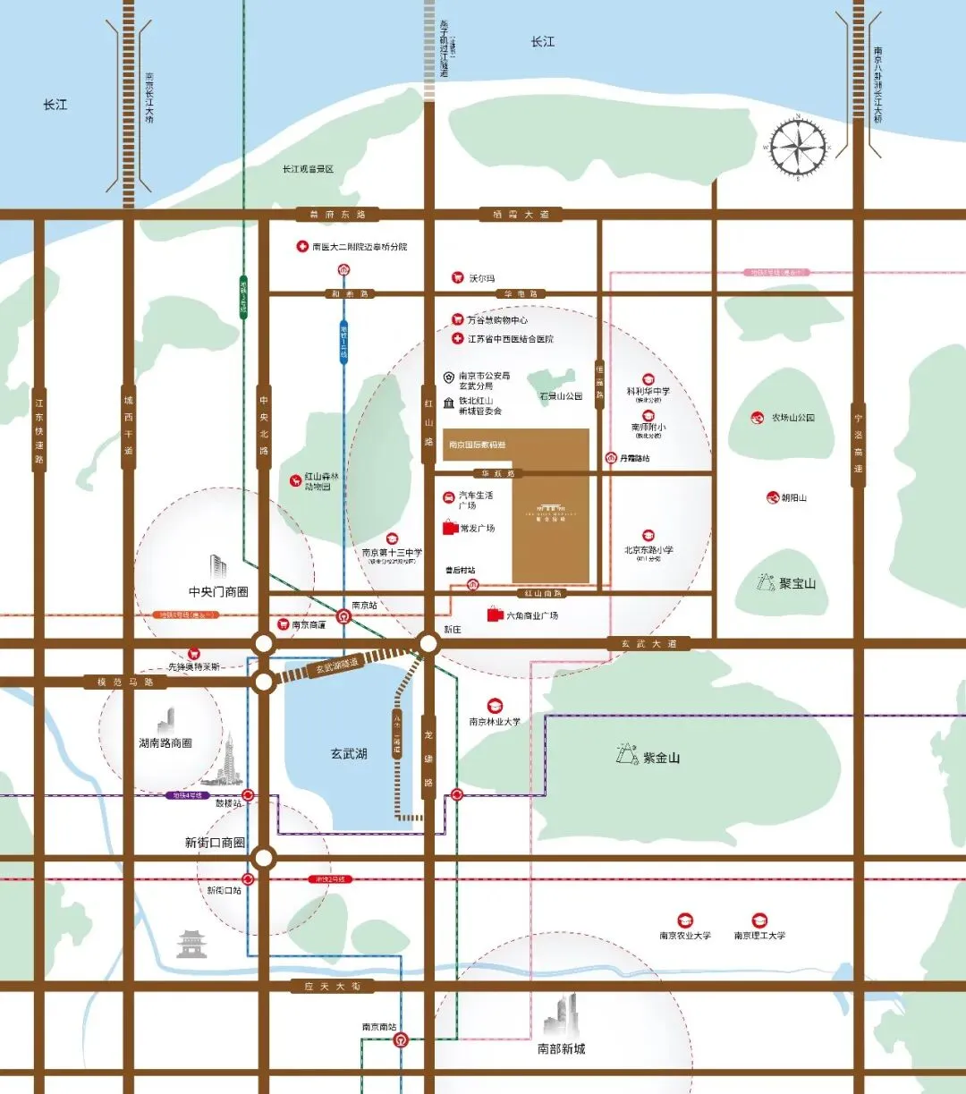此外更坐拥玄武湖、紫金山、红山动物园、鸡鸣寺等,金陵名胜环伺周边,山、水、城、林、浑然一体。作为南京主城内具有文化、商业、旅游、历史沉淀交融的区域,玄武一直是南京的城市核芯资源聚集区。
