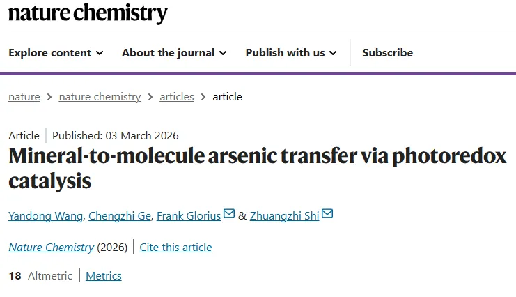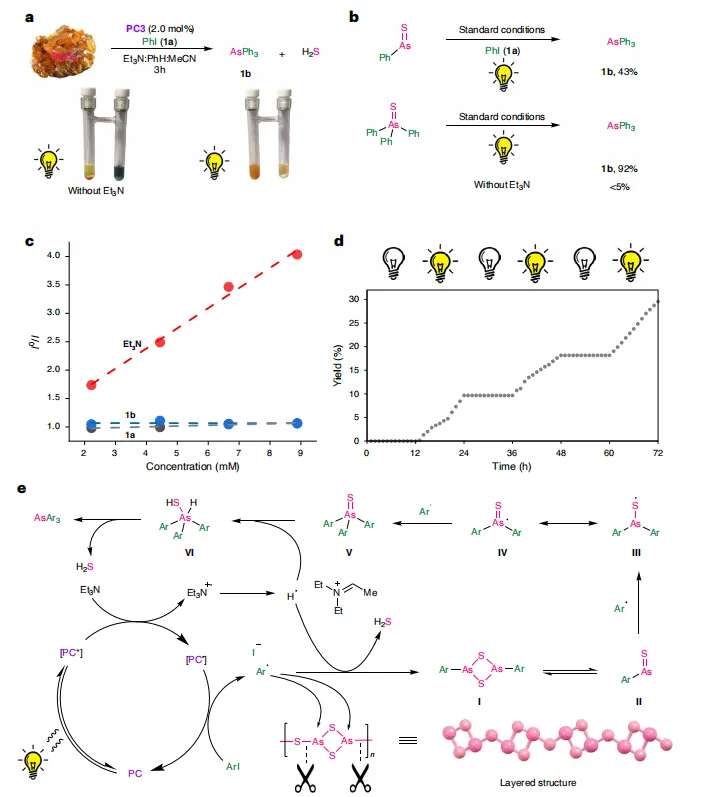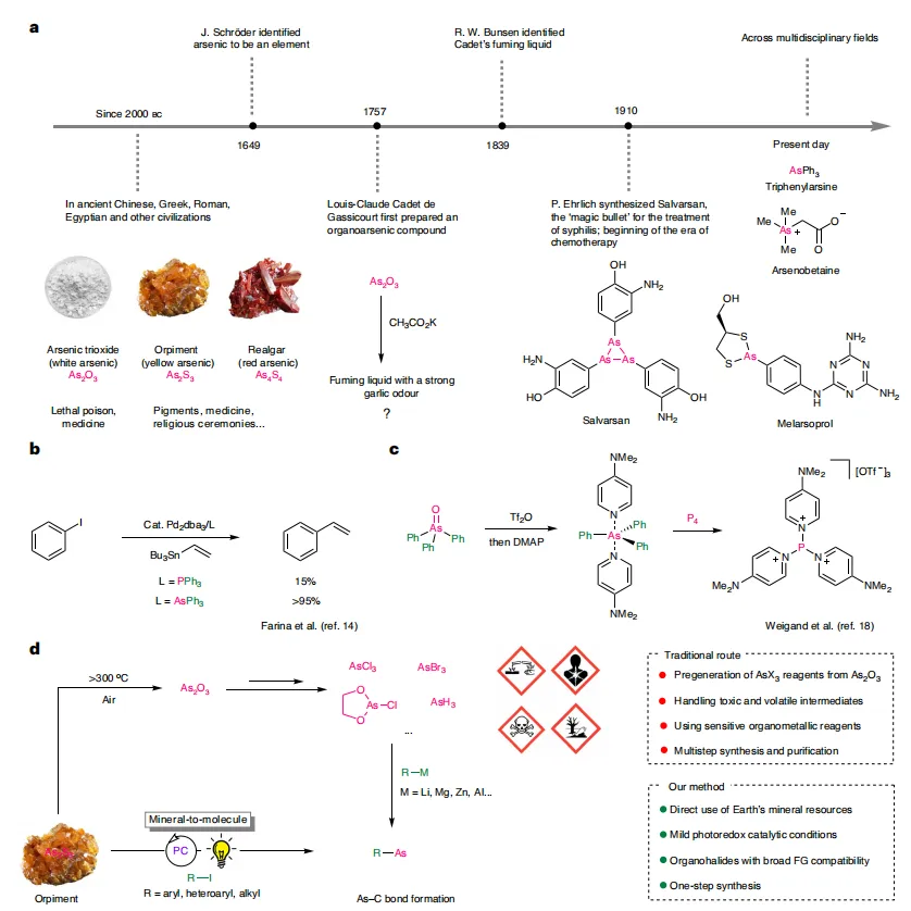 1.首创矿物到分子的砷转化范式:首次以天然雄黄(As2S3)、雌黄(As4S4)等砷硫化物矿物为直接原料,替代传统剧毒砷前驱体,通过光氧化还原催化一步实现 As–C 键构建,从源头上消除了剧毒中间体的使用,大幅提升合成安全性。