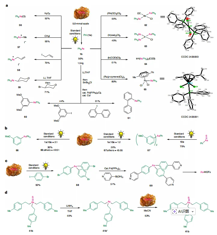 4.具备规模化与实际应用价值:反应可轻松放大至克级规模且收率无明显降低;所得有机砷产物可进一步转化为砷氧化物、季鏻盐、砷基金属配合物等衍生物,还可作为关键前体制备含砷金属有机框架(MOFs),为有机砷化合物的下游应用奠定基础。
