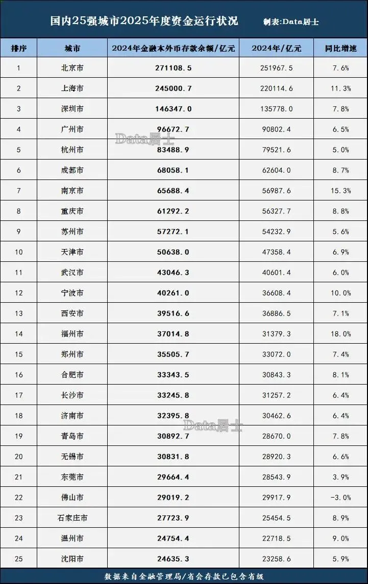 更夸张的现象出现在福州与佛山身上,但前者是因有18%的超高速而使其存款余额暴涨至3.7万亿,与南京一起成为2025年度资金走势上的奇观,福州市因此还超过了郑州市而能跃居第14位;而佛山市则是因出现资金下跌而城市排行连续下滑,从上年的第19位一下就掉到第22位去了。