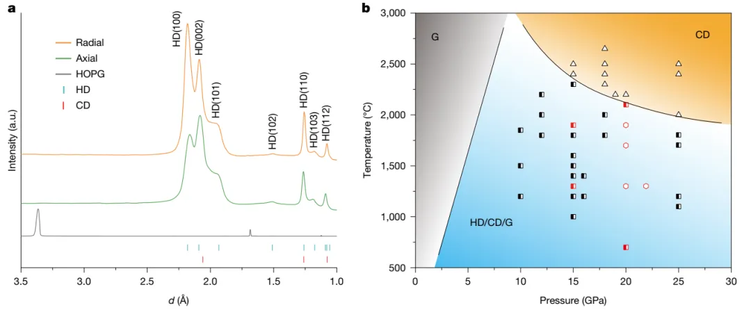 图1.石墨的X射线衍射图谱及压力-温度相图