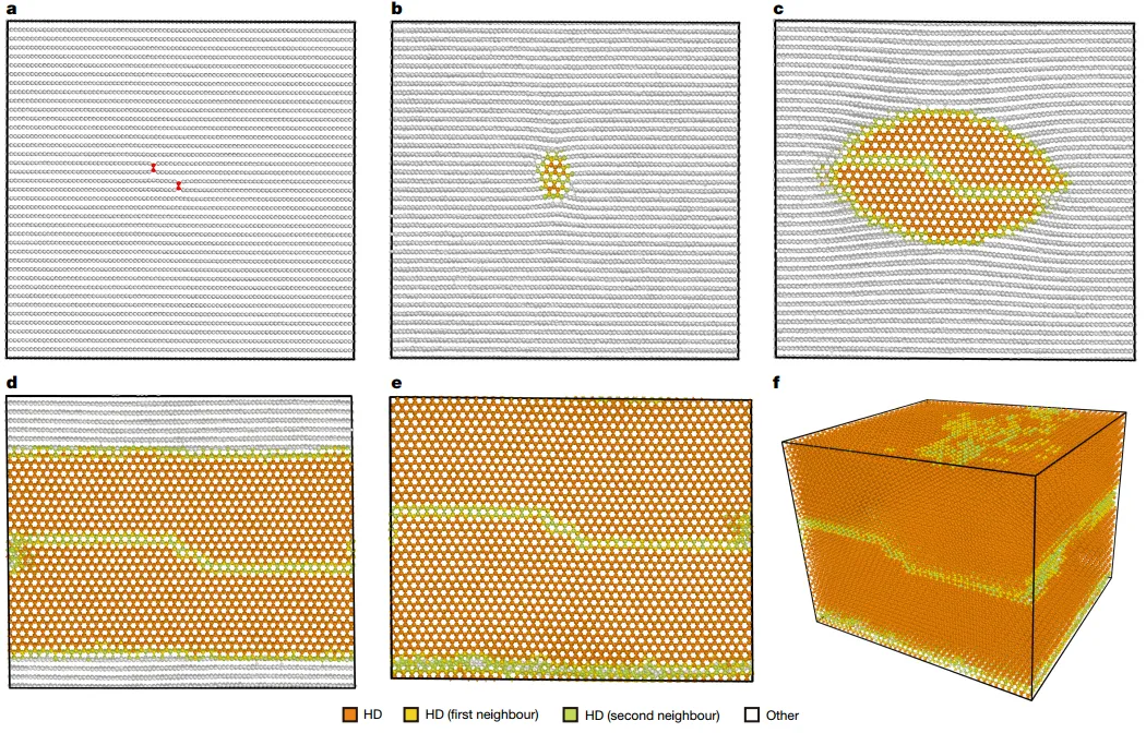 图3.基于机器学习势函数的高取向热解石墨向六方金刚石转变过程的大规模分子动力学模拟