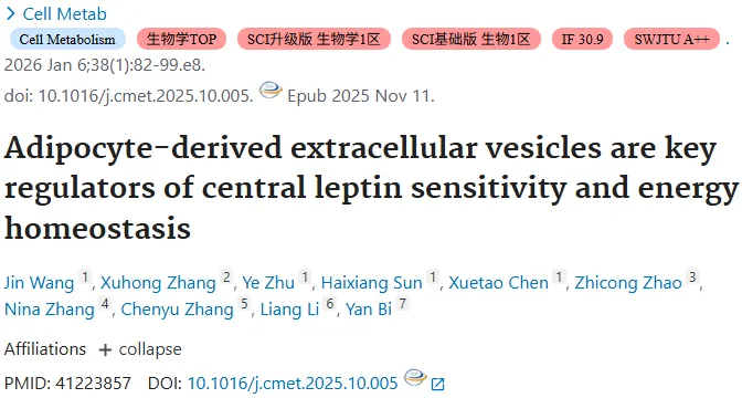 标题:脂肪细胞衍生的细胞外囊泡是中枢瘦素敏感性和能量稳态的关键调节因子