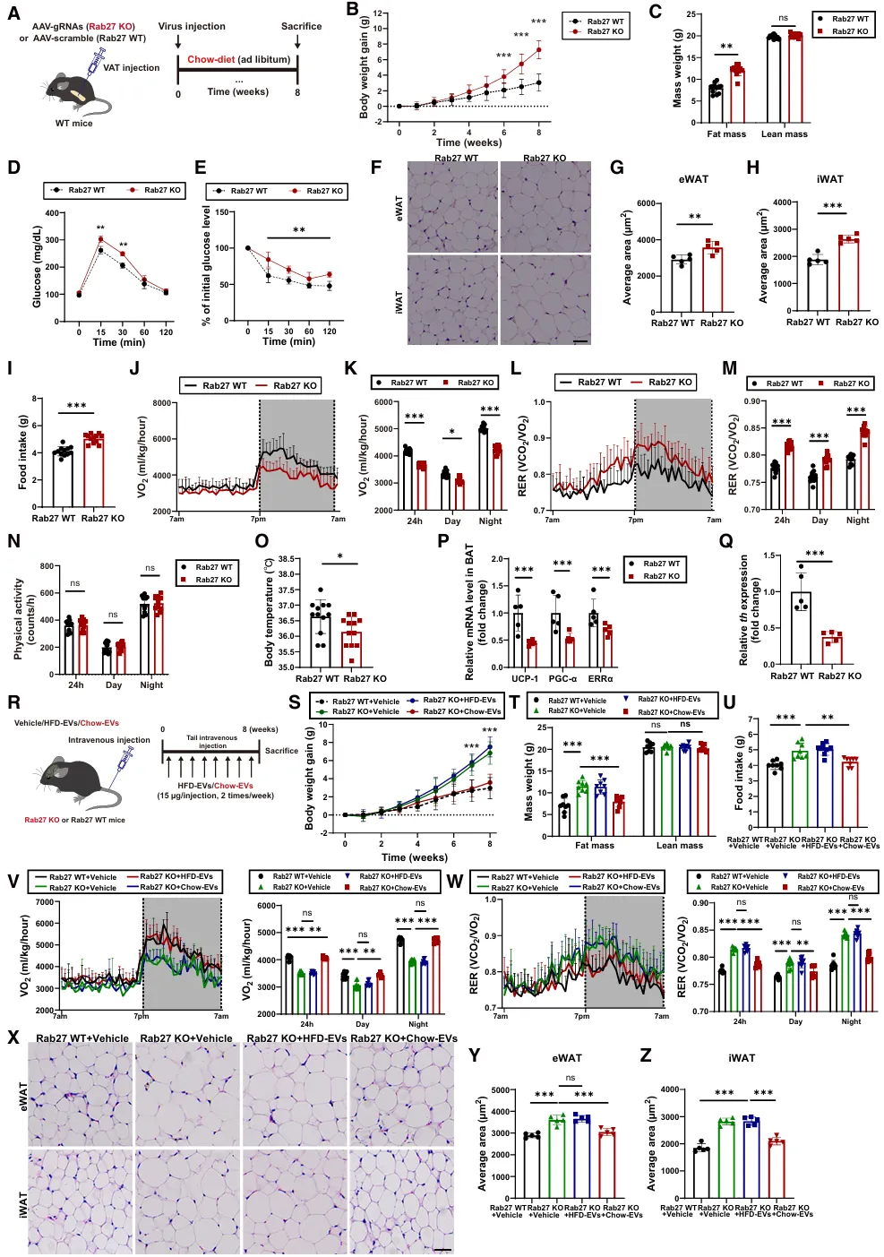 为了确定AT-EVs是否在能量稳态中发挥假设作用,我们通过向Cas9转基因小鼠的脂肪组织中注射携带针对Rab27小指导RNA(gRNA)的AAVs,建立了脂肪组织特异性的Rab27敲除(Rab27 KO)小鼠模型。Rab27是一种对小囊泡分泌至关重要的小型GTP酶(图1A)。