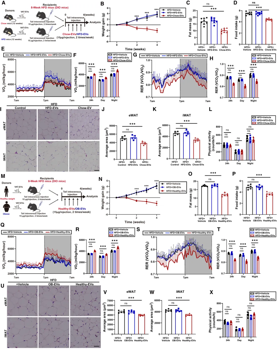 此外,为了确定其对肥胖的潜在影响,对DIO小鼠进行了静脉注射喂食EVs或高脂饮食EVs(图2A)。