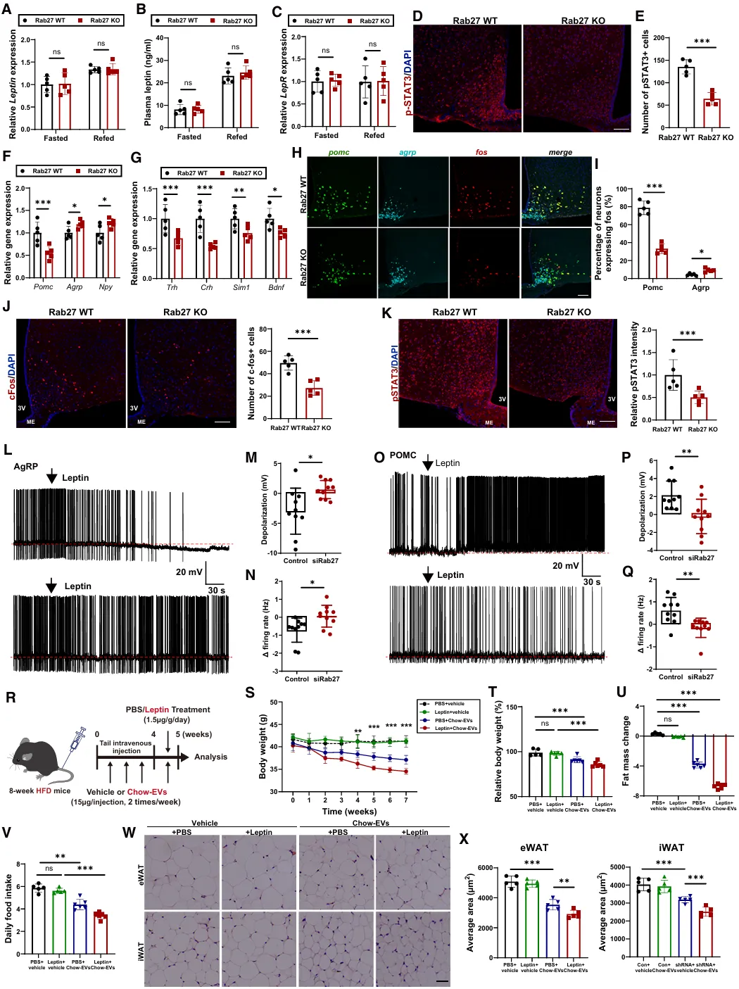 鉴于瘦素对能量平衡的调节作用主要是通过下丘脑LepR神经元介导的,我们评估了AT-EVs对中枢瘦素信号的调节作用。在禁食和再喂食条件下,Rab27 KO小鼠与Rab27 WT小鼠在下丘脑LepR基因表达上未观察到差异(图3C)。