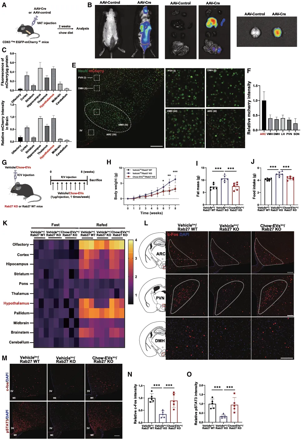 为了确定AT-EVs是否可以直接作用于下丘脑,我们使用了一种脂肪特异性的EV追踪方法。首先,通过向CD63FlagEGFP-mCherryf/f小鼠的脂肪组织中注射表达Cre重组酶的AAV进行体内AT-EV追踪和筛选(图4A)。