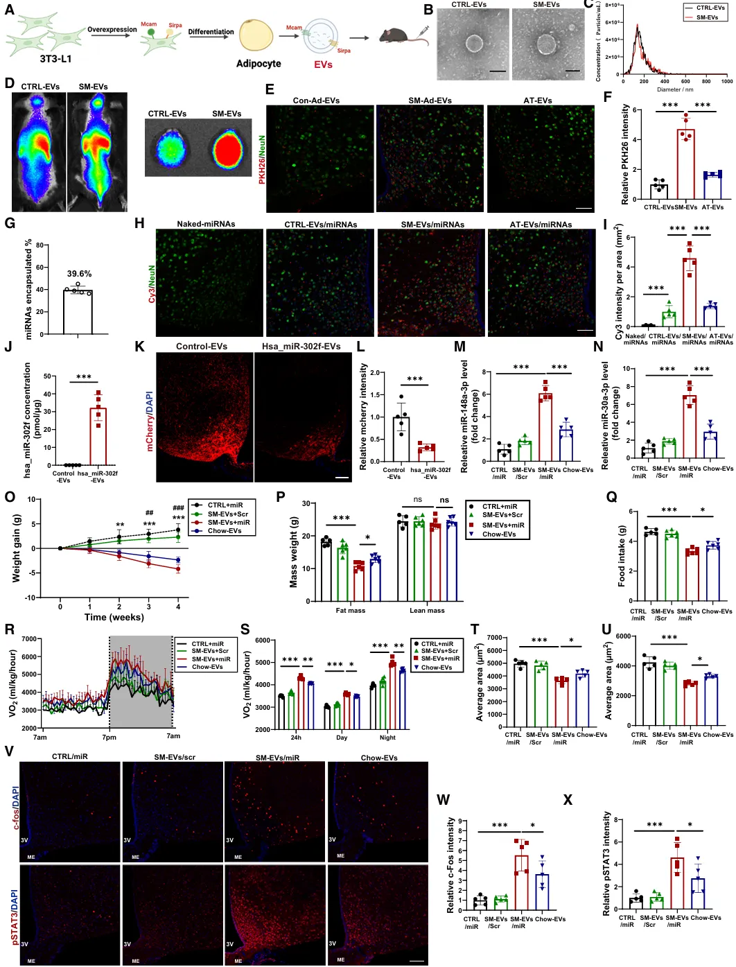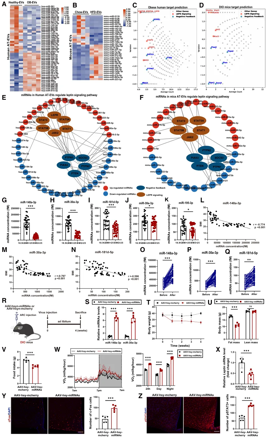 本研究通过动物模型、测序及示踪技术发现,脂肪细胞囊泡携带特定miRNA靶向下丘脑,通过抑制瘦素信号负调控因子维持瘦素敏感性;利用工程化囊泡递送这些miRNA可逆转肥胖小鼠的瘦素抵抗。