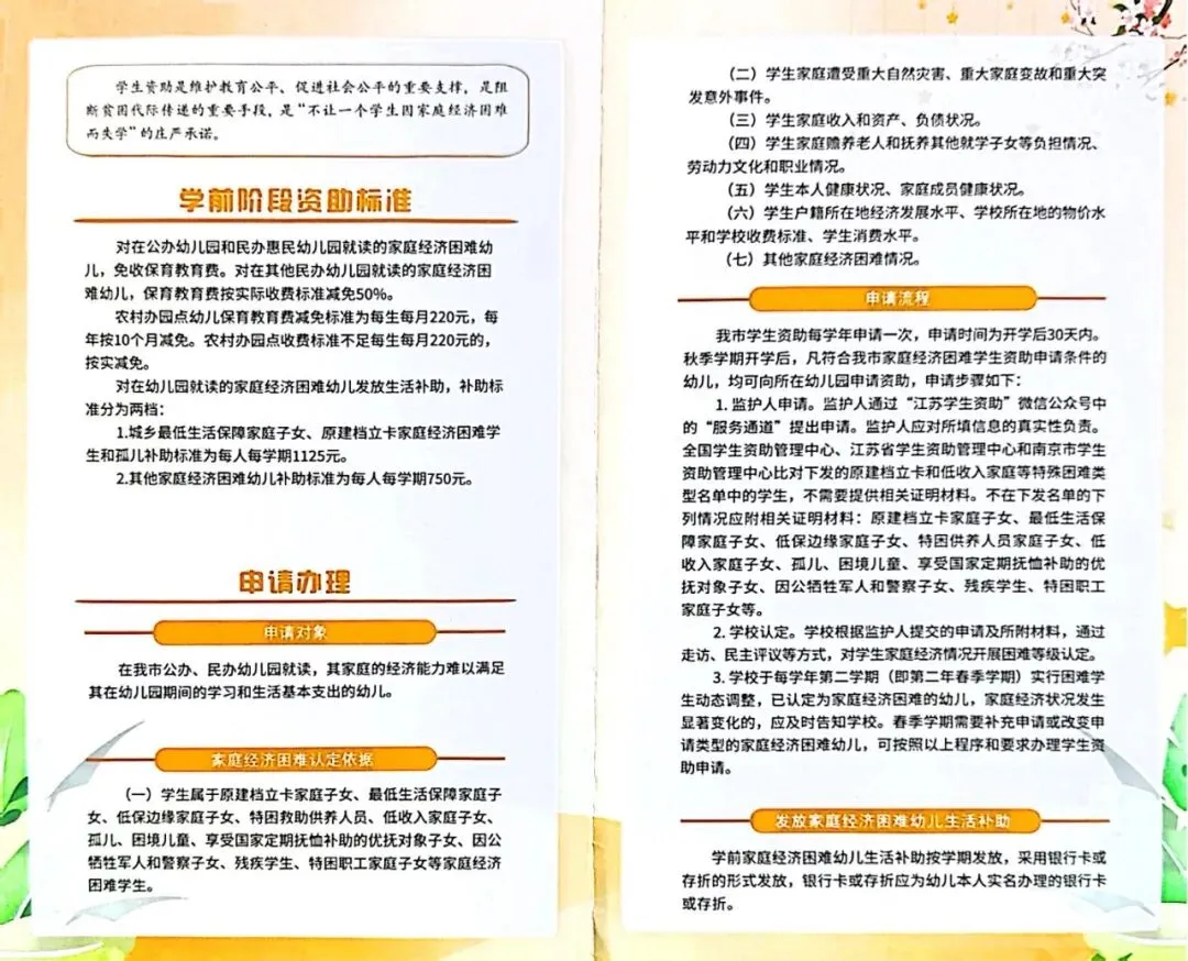 您们好!家庭经济困难学生资助是教育公平的重要基础,是教育民生的重要工作。为进一步做好我园家庭经济困难幼儿的资助工作,提高幼儿资助精准度,根据《教育部等六部门关于做好家庭经济困难学生认定工作的指导意见》《省教育厅等六部门关于印发<江苏省家庭经济困难学生认定工作实施办法>的通知》《南京市家庭经济困难学生认定工作实施办法的精神》,结合我园实际情况,现全面开展家庭经济困难幼儿的资助工作,切实保障困难幼儿的切身利益,让教育资助温暖每一名困难幼儿,帮助他(她)们健康、快乐的成长,请大家仔细阅读以下《资助申请指南》。