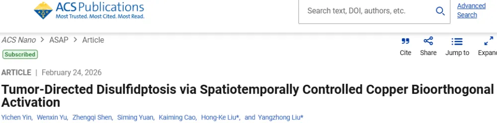 近日,中国科学技术大学刘扬中教授团队与南京师范大学刘红科教授团队合作,在《ACS Nano》期刊上发表了一项创新研究成果。该研究针对肿瘤治疗中的选择性诱导细胞死亡难题,开发了一种基于铜触发生物正交反应的“肿瘤内点击化学工厂”策略。这一方法能够在肿瘤细胞内原位合成细胞毒性物质,特异性诱导二硫化物死亡和铜死亡两种新型程序性死亡通路,为精准癌症治疗提供了新思路。二硫化物死亡是近期发现的细胞死亡机制,其关键调控蛋白SLC7A11在多种癌细胞中高表达,使得肿瘤细胞在代谢应激状态下更易发生二硫化物应激。然而,如何在肿瘤组织中特异性激活这一死亡通路一直面临挑战,本研究通过精巧的生物正交设计成功解决了这一难题。