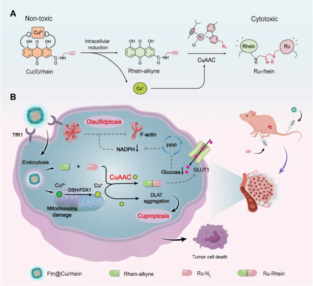 研究团队设计了一种双前药系统,其中一种前药是叠氮修饰的钌配合物(Ru–N₃),另一种是炔烃偶联的大黄酸衍生物与铜形成的配位复合物(Cu/rhein)。为提高肿瘤靶向性,研究人员将Cu/rhein包载于具有天然肿瘤靶向能力的铁蛋白纳米笼中。当这两种前药同时递送至肿瘤区域后,细胞内环境将Cu(II)还原为具有催化活性的Cu(I),进而启动铜催化的叠氮-炔烃环加成反应。这一生物正交反应在肿瘤细胞内原位生成细胞毒性产物Ru-rhein加合物,而正常细胞由于前药浓度较低,几乎不受影响。这种靶向激活策略有效避免了传统化疗药物的全身毒性问题,通过空间控制实现了治疗效应的局部化,显著提高了治疗的安全性指标。