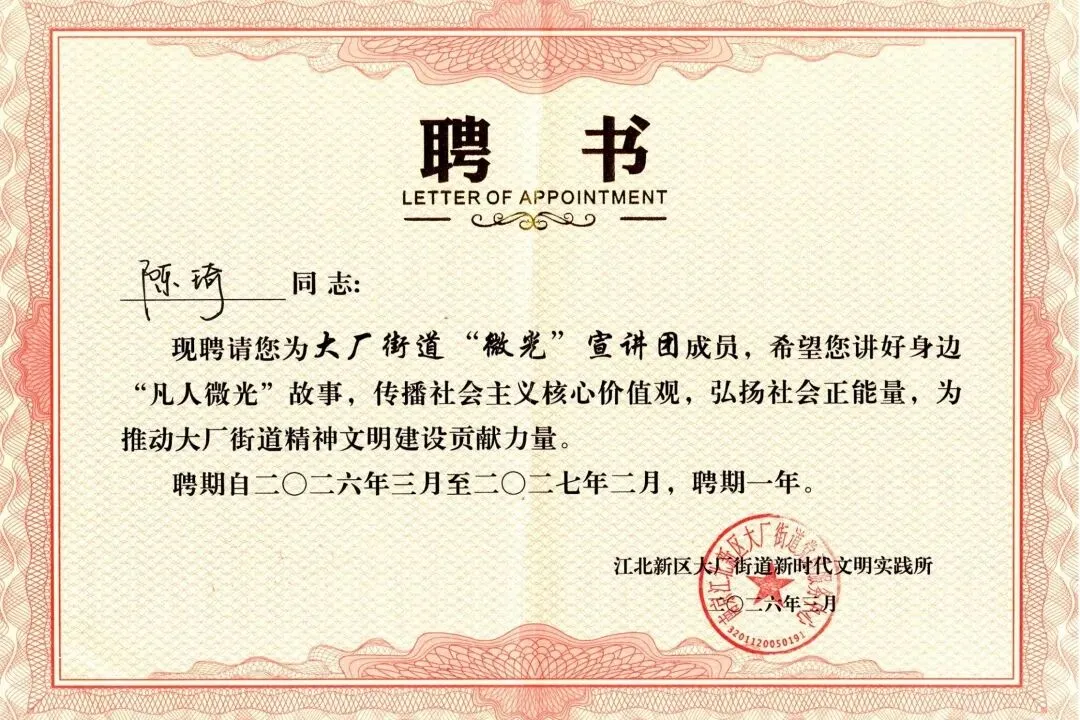 在活动中,大厂街道正式聘任我厂1名员工为“微光”宣讲团成员,今后将定期进社区开展主题宣讲,进一步深化企地共建实效。持续传递电厂的温度与担当。