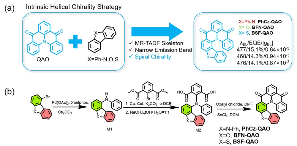 方案 1 (a)苯基咔唑 - 醌吖啶酮、二苯并呋喃 - 醌吖啶酮和二苯并噻吩 - 醌吖啶酮的分子设计策略与化学结构。(b)圆偏振多共振热活化延迟荧光发光体的合成路线。