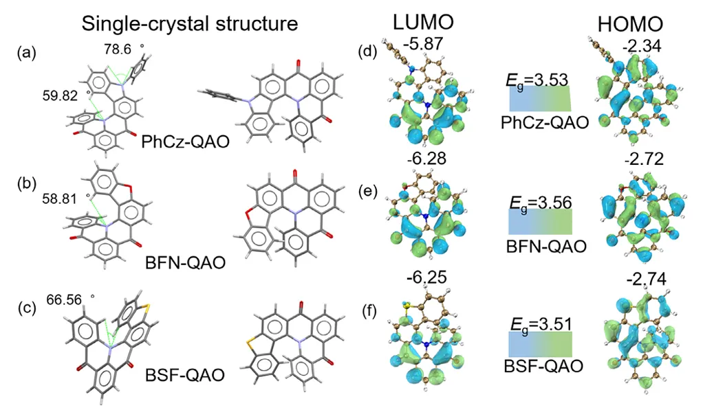 图 1 (a-c)外消旋体苯基咔唑 - 醌吖啶酮、二苯并呋喃 - 醌吖啶酮和二苯并噻吩 - 醌吖啶酮的单晶及堆积结构;(d-f)利用密度泛函理论计算得到的苯基咔唑 - 醌吖啶酮、二苯并呋喃 - 醌吖啶酮和二苯并噻吩 - 醌吖啶酮的前线分子轨道分布以及最高占据分子轨道和最低未占据分子轨道的能级