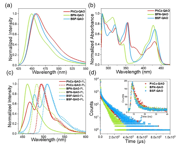 3 光物理性质方面:测试稀甲苯溶液和掺杂薄膜中发光体的紫外 - 可见吸收光谱、光致发光光谱,测定绝对光致发光量子产率;通过 77K 低温发光光谱计算单重态 - 三重态能级差,结合室温瞬态光致发光衰减曲线和变温瞬态光致发光衰减曲线,证实热活化延迟荧光特性,并计算辐射衰减速率、反向系间窜越速率等动力学参数。